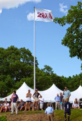 More than the usual number of spectators and ‘visitors’ had gathered at Red Top’s boathouse last Saturday to watch the races, although you only actually see the crews coming up the river the last mile of the course. Of course, there were the regular numbers of pretty girlfriends of the oarsmen, and the rowers’ parents and a few grandparents, but also a good amount of ‘old oars’ who had rowed for Harvard way back when, including some of Harry’s old boys, who had arrived from near and far to honour him. A memorial had been built in tribute to Parker at Red Top. Designed by artist Ellen Kennelly, whose father had rowed for Harvard, the memorial is ‘a curved stonewall representing the bend of an oar, with a flagpole at its apex, representing the pin of the oarlock. Atop the wall sits a bronze cast of Harry’s infamous megaphone – dents, scratches and all’, Row2K, wrote on its website. See a picture of the memorial here.