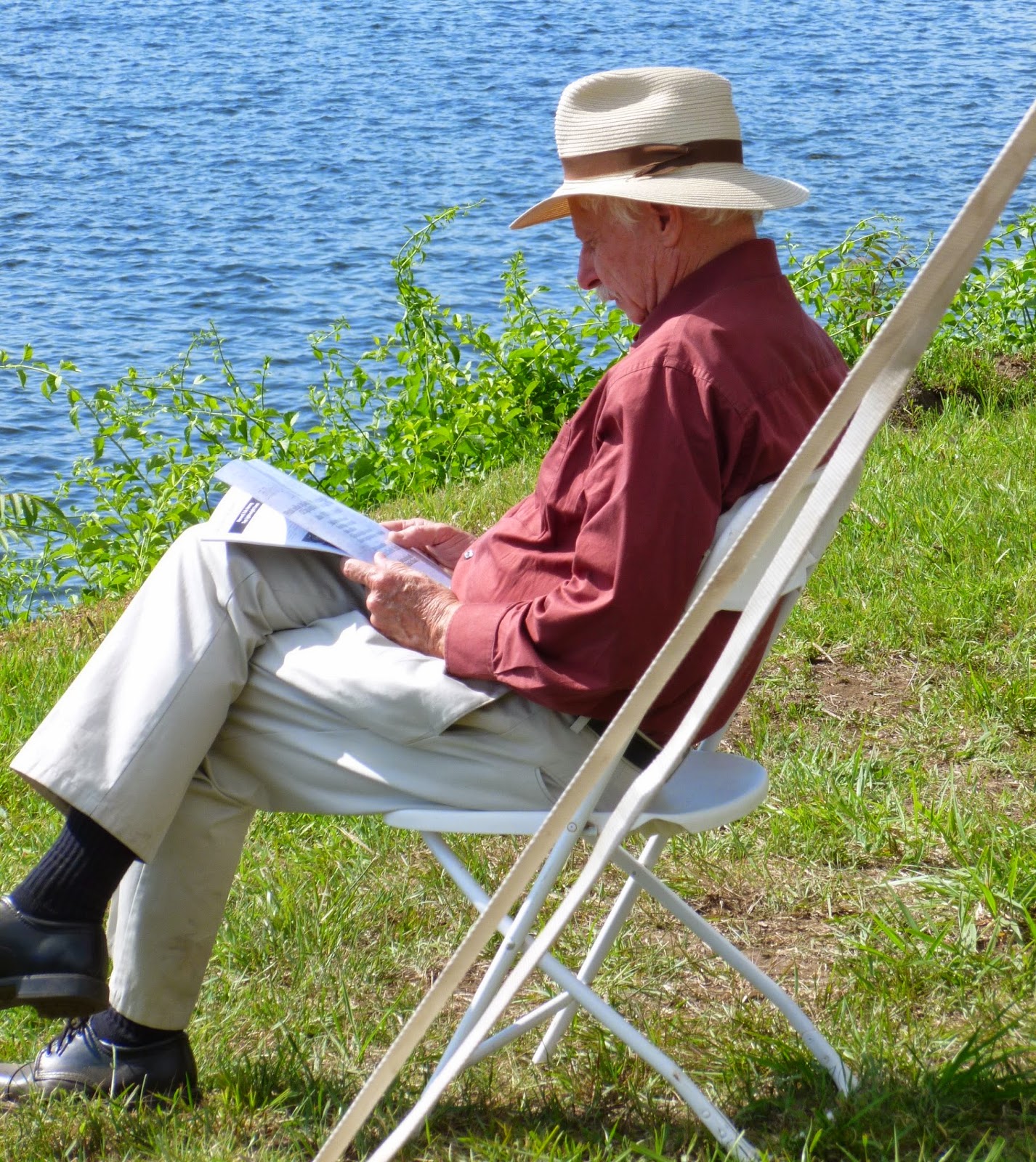 Two Crimson ‘old oars’ watching the river, where a winning Harvard crew is approaching the dock at Red Top.