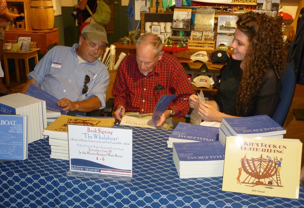 At a book signing for The Whaleboat in the Mystic Seaport Bookstore during the 2014 WoodenBoat Show, Walter Ansel, Will Ansel and Evelyn Ansel.