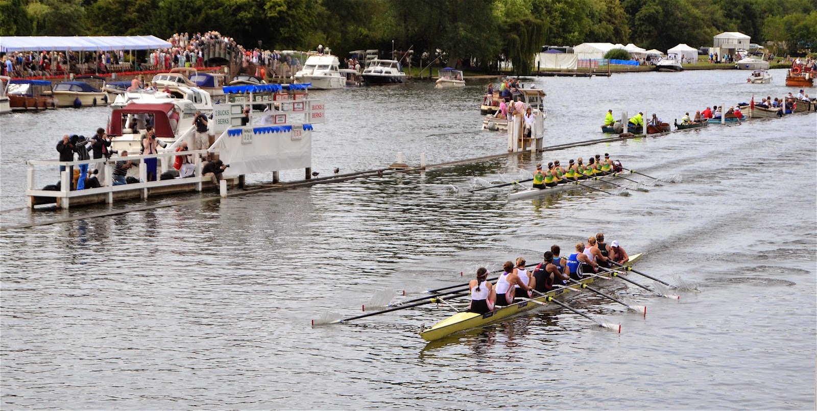 Cornell pursue Oxford Brooks in the Temple. They are passing the ‘hole in the wall’ on the far bank. The ‘hole’ is an inlet crossed by a hump back bridge on land owned by Phyllis Court, a country club sited opposite the finish.