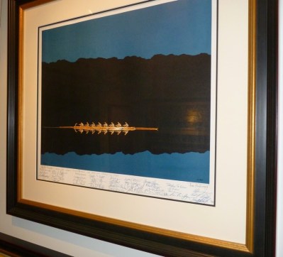 “Late Fall Practice” by oarsman Jim Anderegg. This print hangs in the exhibit “Let Her Run” in the G. W. Blunt White Building at Mystic Seaport, Mystic, Connecticut, the same building that holds the NRF’s National Rowing Hall of Fame. This particular print has been signed by the 1984 rowing team of Brown University.