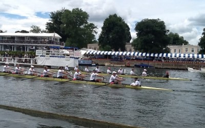 Union Boat Club, closes to the camera, meeting Harvard for a celebratory row at Henley Royal Regatta this summer.