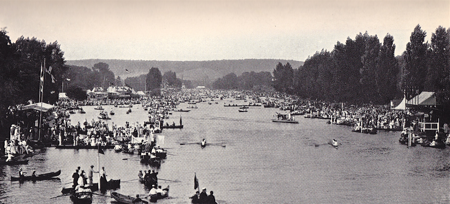 Fifty yards below the top of the Island I steered into a pile, a fearful crack which split the boat. Luckily, we were rowing with swivels, and it didn’t take long to clear ourselves and get going again, but in the interlude, Pitman and Crum spurted and had taken several lengths off us. With a very leaky boat and a bent rowlock we started out to chase them. It looked hopeless, but by dint of great efforts and a high stroke, we caught them at the half-mile mark. We led at Fawley by half a length, getting slower and slower as the water rose over our heel traps. By superhuman efforts we had a length and a half at the mile, with the water over my insteps. The water continued to rise, and we were not clear of them when we passed over the line.