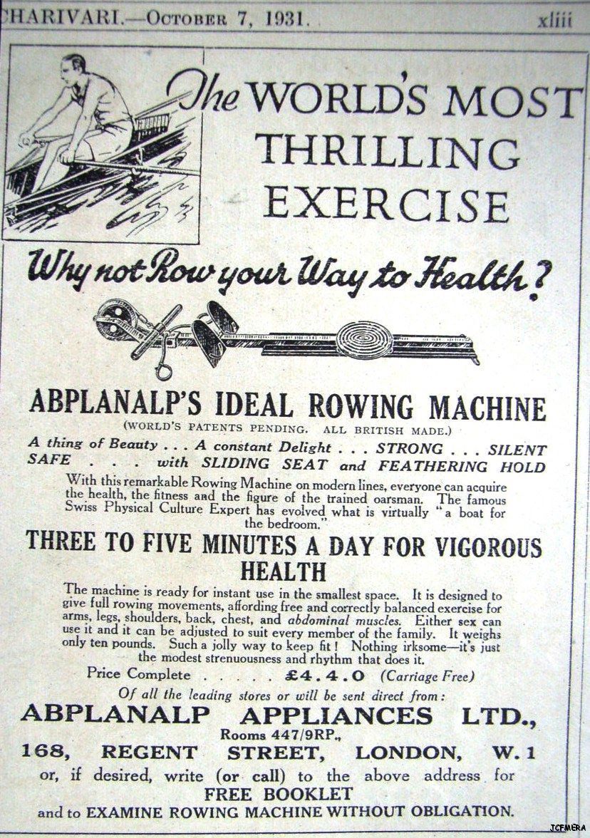 Warren’s favourite model is a 1932 Swiss model by Abplanalp Appliances Ltd. I found an advertisement for this machine in the 7 October 1931 edition of Punch, or the London Charivari. It boasts ‘The famous Swiss Physical Culture Expert has evolved what is virtually “a boat for the bedroom”’. Interestingly it also states that it is ‘All British Made’.