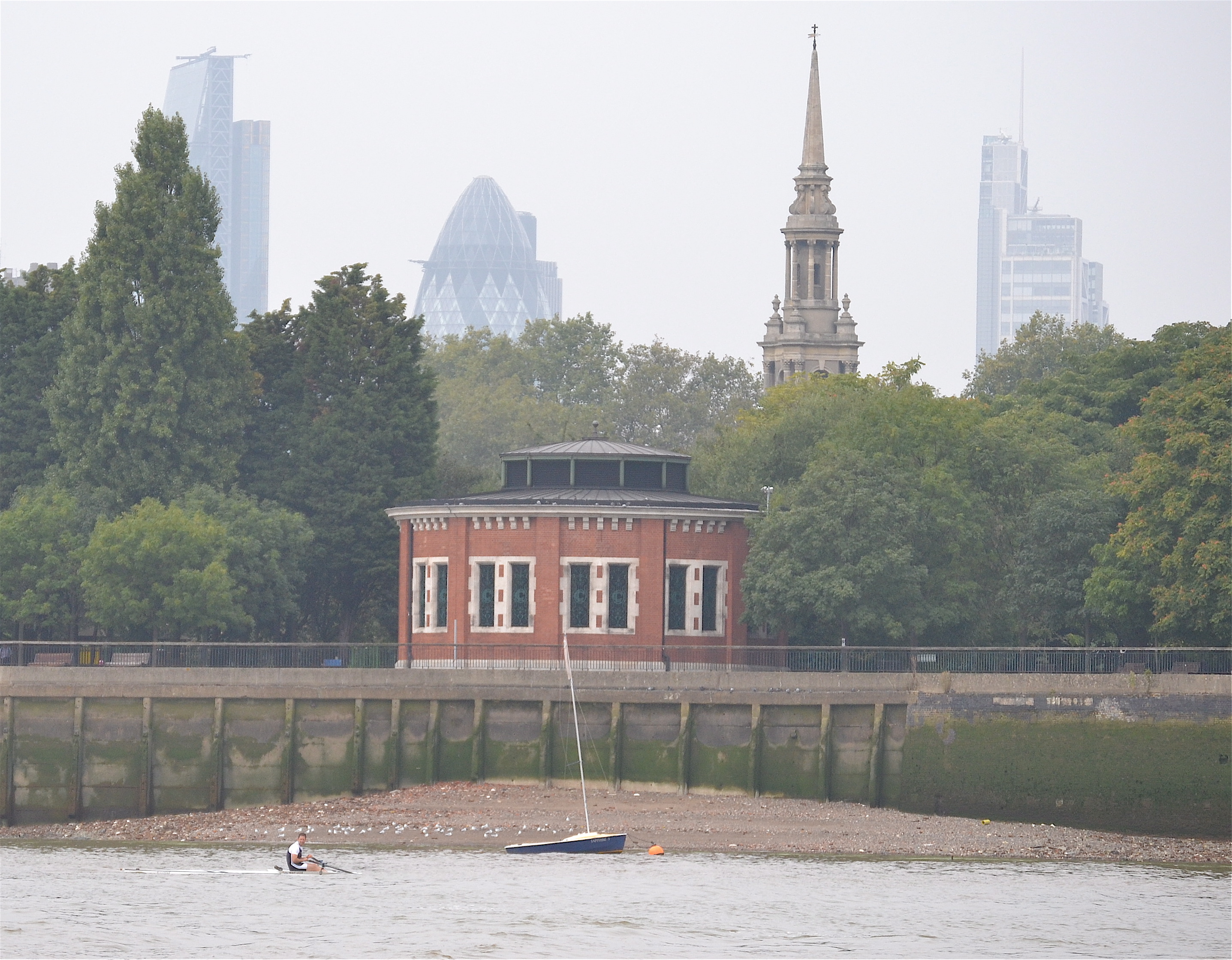 At 12 o’clock with very little wind and a good flood tide, the competitors lined up. Closest to the north shore (the Wapping side) was Sean Collins, then Lou Pettipher, Ben Folkard, Alfie Anderson, Merlin Dwan and finally, nearest to the south (Rotherhithe) side was Chris Anness.