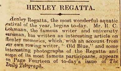 Later in the year and only a month before war was declared, Henley Royal Regatta began with coverage by the paper’s rowing writer, now styled ‘Old Blue’. HTBS editor Göran Buckhorn suggests that this may have been Charles Cox, who rowed at Trinity Hall, Cambridge (Blue in 1901), and who was editor of the rowing column of The Field between 1903 and 1920 and then wrote under the signature ‘Old Blue’ for The Daily Telegraph between 1921 and 1927.