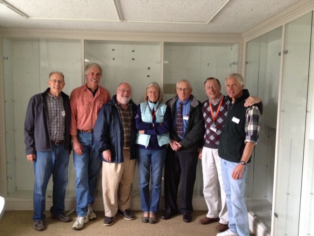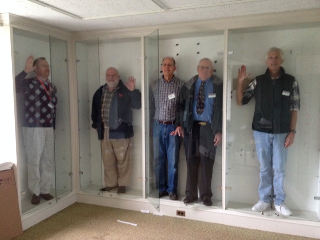 Today, a gloomy and rainy day in Connecticut, the good fellows at the moving company The Gentle Giant came to pick up what rowing historians Bill Miller and Tom Weil, and some volunteers of the National Rowing Foundation had packed during several days: the remaining rowing artefacts in the Rowing Hall of Fame and the rowing history exhibit, “Let Her Run”. The morning started with some refreshment brought in by Gill Perry, champagne and cookies. Although, a sad occasion, as we do not know when ‘the Hall’ and all the wonderful rowing memorabilia will be on display again, there was still room for some ‘play’, which is obvious from some of these photographs, taken by Gill. The last things leaving the rowing exhibit in the Blunt White Building at Mystic Seaport, it was said, were the rowing historians and the NRF’s volunteers – splendid people all!