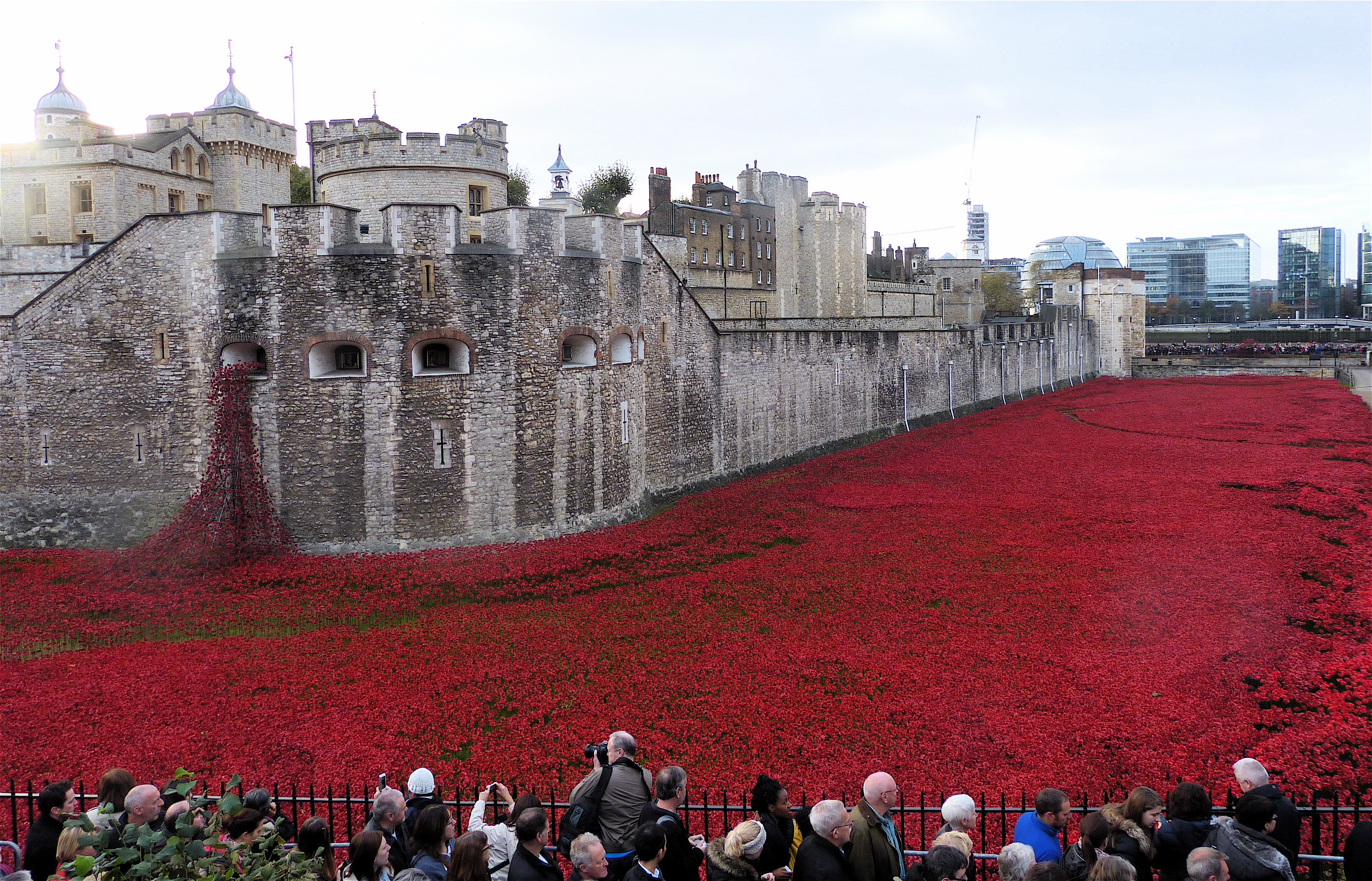 Under the title, ‘Nothing To Do With Rowing’, on 6 October, I reported on the remarkable installation at the Tower of London that commemorates the British dead of the 1914 – 18 War. “Blood Sweeps Land and Seas of Red” was created by ceramic artist Paul Cummins and stage designer Tom Piper, and it consists of 888,246 ceramic poppies which have progressively filled the Tower’s (dry) moat over the summer. Each poppy represents a British military fatality during the Great War. The display has captured the public’s imagination and four million people have queued to see it. I took these pictures at 8am on 8 November, the day before Remembrance Sunday, and the Tower was already surrounded by people standing four deep. Its ‘success’ (if that is not an inappropriate word) probably lies in the fact that we cannot imagine nearly 900,000 deaths but this visual representation starts to give us some concept of the scale of the carnage. For those of us who are aware of an ancestor that was killed in that War, the knowledge that they are represented by one of the poppies adds to the poignancy. For me, one poppy commemorates my great-grandfather, Thomas Davies.