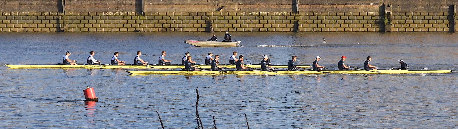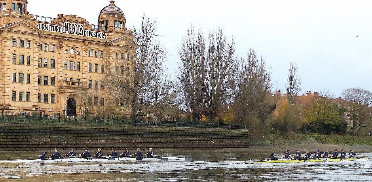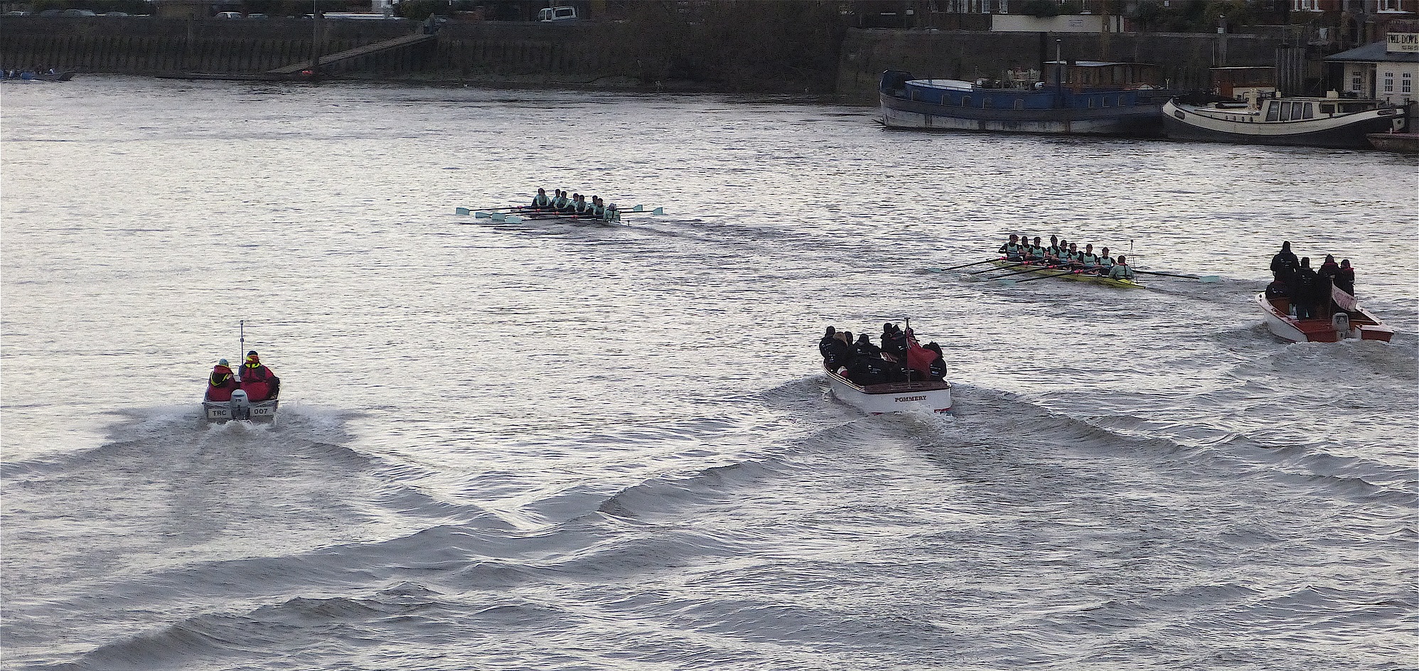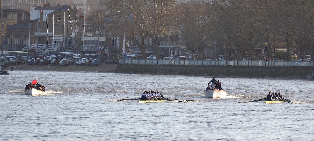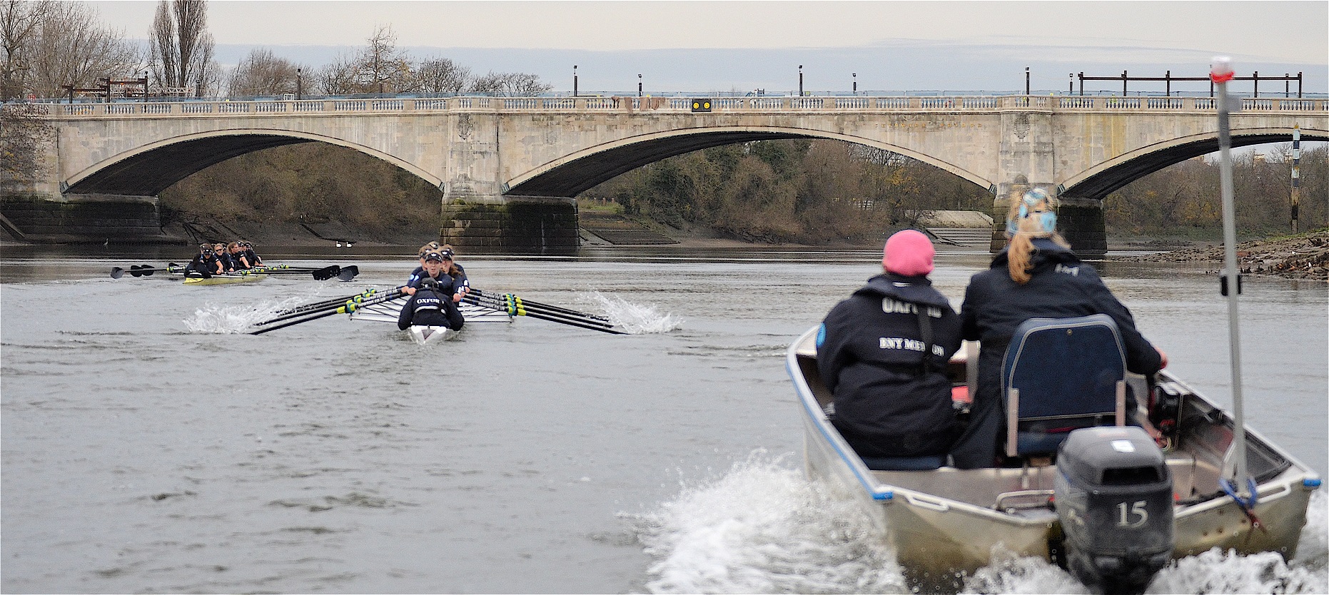 The Oxford – Cambridge Boat Race Tideway Trials took place over the full 4 1/4 mile Putney to Mortlake Championship Course on 9 December for the women and on 10 December for the men. These were not contests of Light Blue v Dark Blue, they were intra-university races, Oxford racing Oxford and Cambridge racing Cambridge, where the last sixteen rowers and last two coxswains from each university battle it out in theoretically matched boats, all eighteen hoping to impress the coach who has to make the final selection. This is the only time that the candidates for the Blue Boats will race the full course and the Trials are an important learning experience for athletes and coxes and an intense selection test, especially as it gives some indication of how individuals may cope with race day pressure.