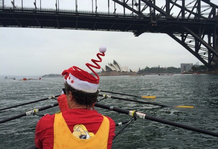 A tricky question children often ask is, how can Santa deliver presents to children across the world? Well, I don’t know how he does it but whatever he does, it seems he still had time this morning to join a multitude of rowers for the yearly Santa Row from the Opera House to the Sydney Harbour Bridge.