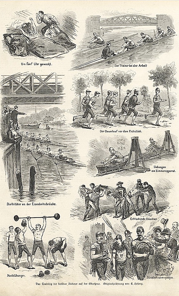 The top picture is titled ‘Berlin rowers training on the Oberspree, 1885’, and the lower picture is of the opening of the watersports season, Berlin, 1928. While the British claim to have invented (or at least codified) rowing as a sport, Germany was among the most enthusiastic of the countries that adopted it as a popular pastime, quickly developing its own traditions.