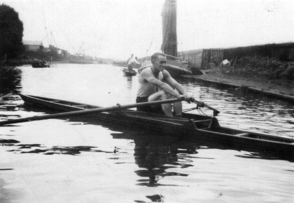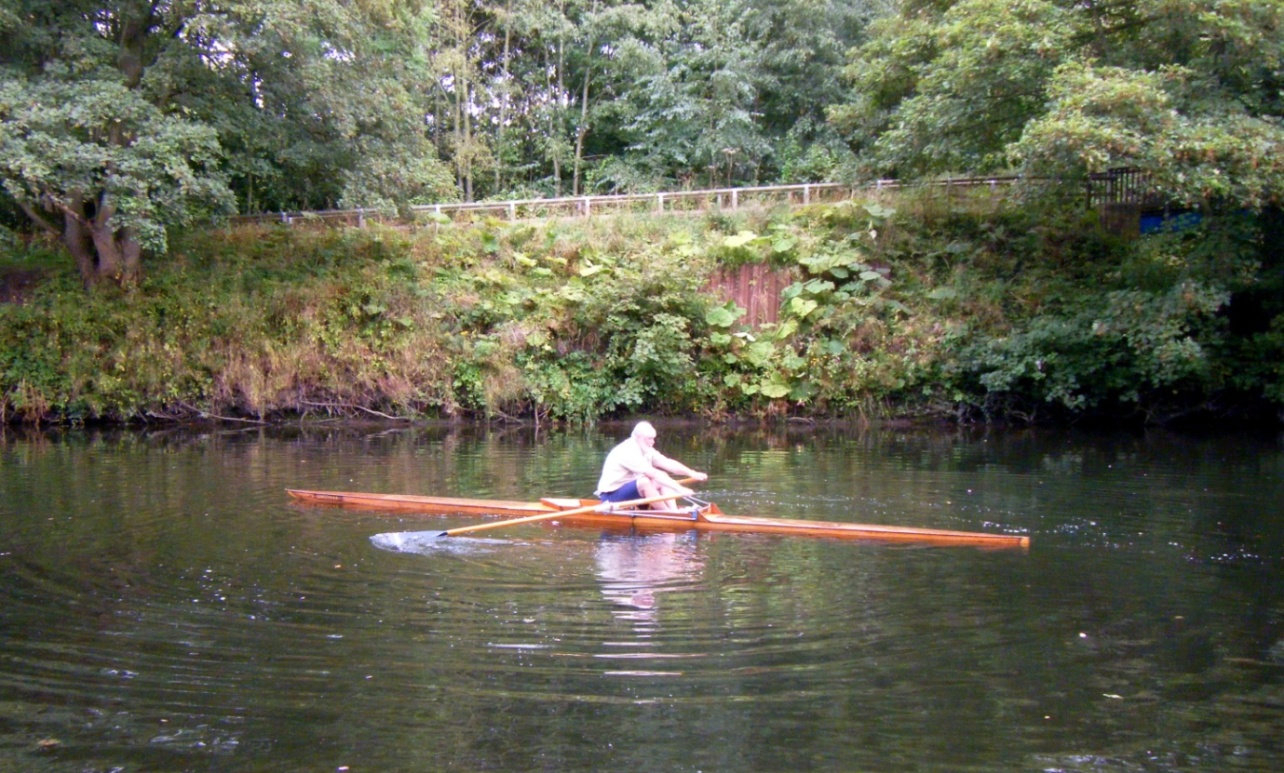 A June 2015 picture of John Ivey sculling on the Lea near Lea RC in a 1958 sculler built by Sid Radley.