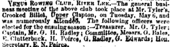 In a newspaper clipping from Sporting Life of 8 July 1862, I found the first record of Radley involvement in competitive rowing. Venus Rowing Club was founded by George Radley, who started the Radley boatyard business.