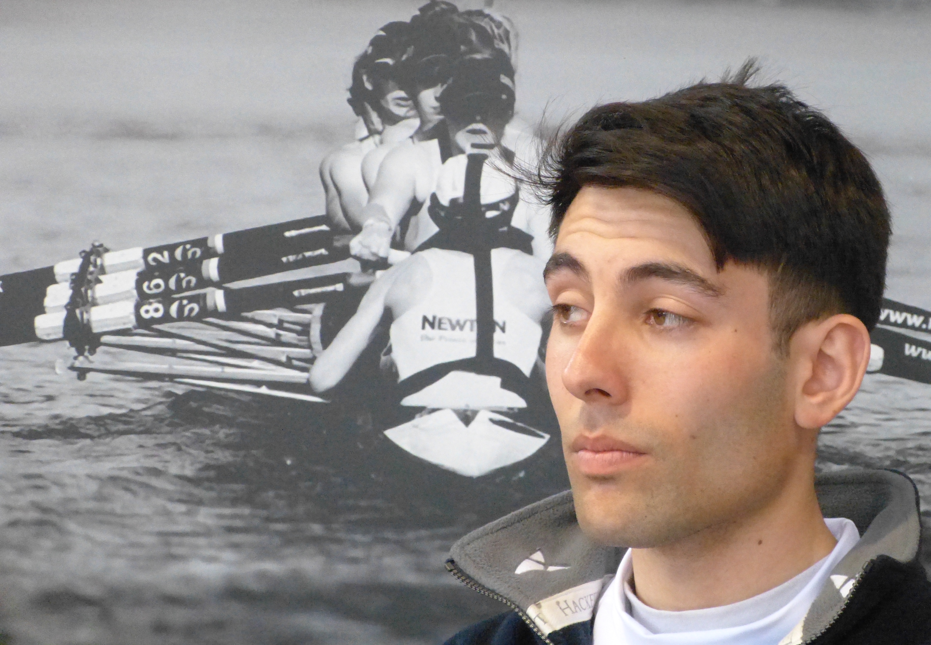 Oxford’s coach Sean Bowden, cox Will Hakim and president Constantine (‘Stan’) Louloudis. Photo: Tim Koch.Cox Hakim is unworried.The Oxford women’s Blue Boat cox, Jennifer Ehr, makes an amusing reference to the sinking of her crew earlier in the week.