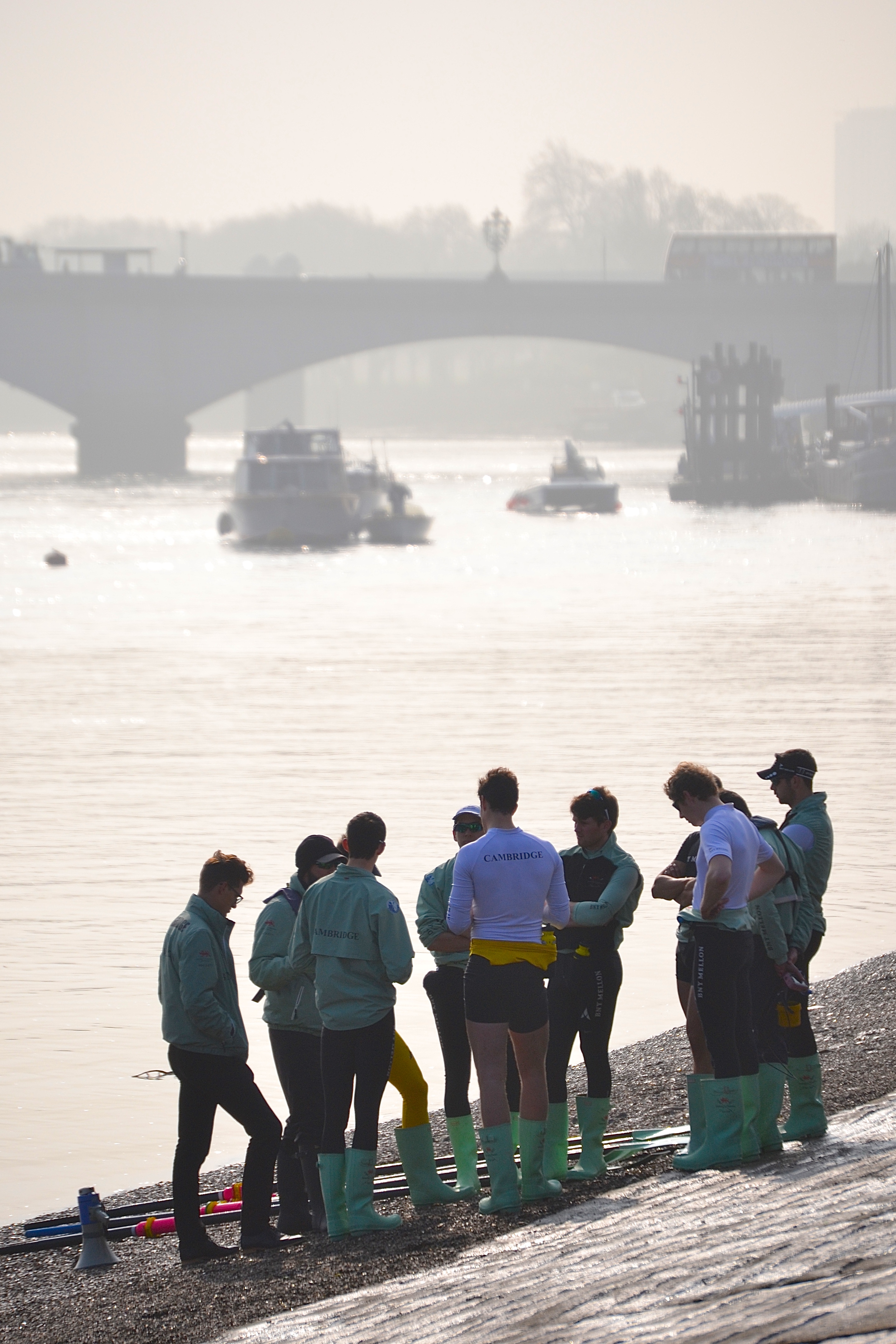 Goldie (Cambridge men’s reserves) discuss tactics in the morning haze.The Oxford boatman arranges the boots belonging to Isis (Oxford men’s reserves) in crew order, ready for their return from their outing. I suggested that he put ‘L’ or ‘R’ on them as well.