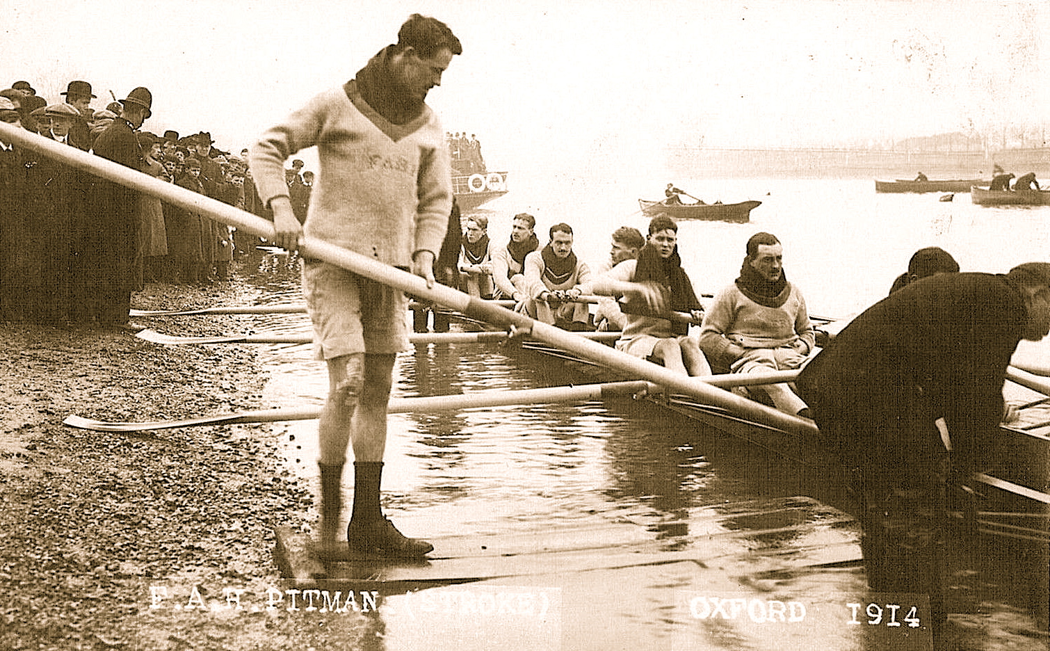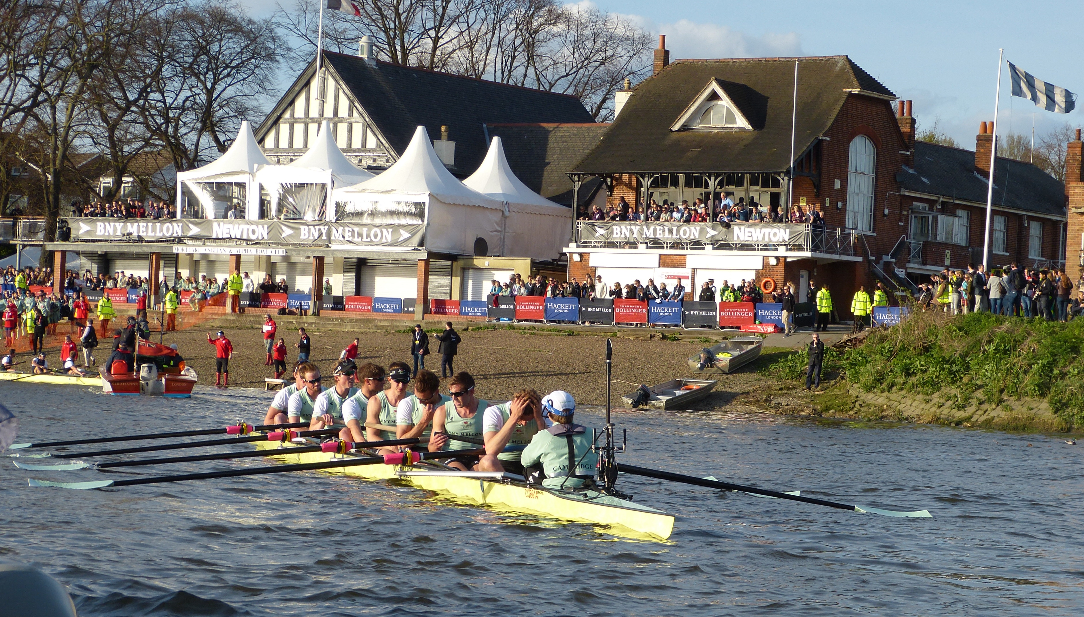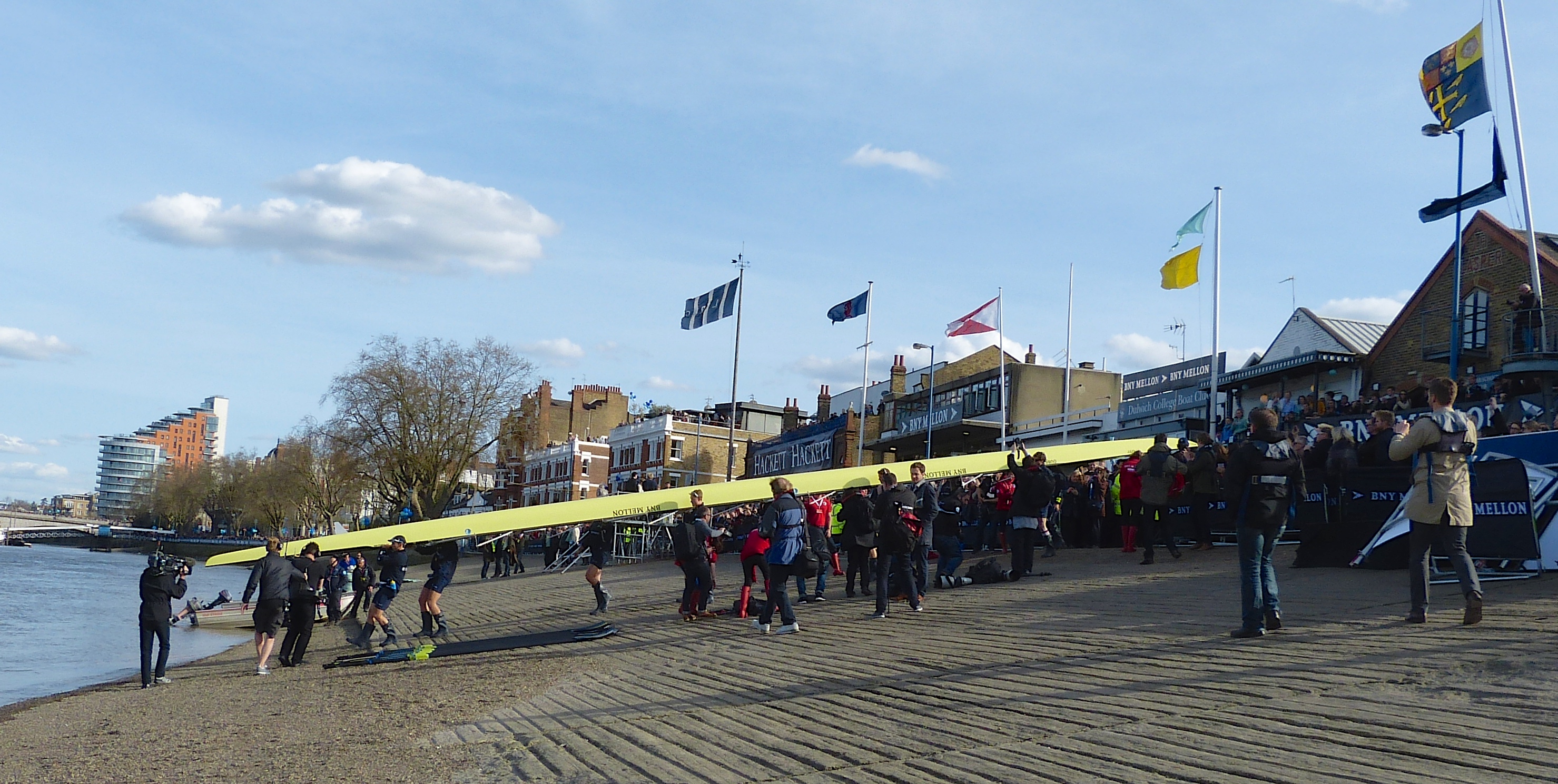 I have often noted that for something to appear unchanging, in reality it must constantly if subtilely evolve. In rowing, this is no better illustrated than looking at Boat Race Day, a unique event dating from 1829 whose popularity continues in a very different age to the one in which it was conceived. The usual complaint from those outside (and a few inside) rowing is that ‘The Day’ is now too commercial. As is usual with those who hark back to some ‘golden age’ (that usually never actually existed) they forget just how bad things actually were before the change about which they rail against. Before professionalism (i.e. before sponsor’s money) the 4 1/4 mile event was a race only until the fitness ran out (around Hammersmith) and then it was a procession to the finish. Many people did not realise this until the television age when they could see these facts for themselves, previously disguised by radio commentators’ florid descriptions or pressmen’s purple prose.
