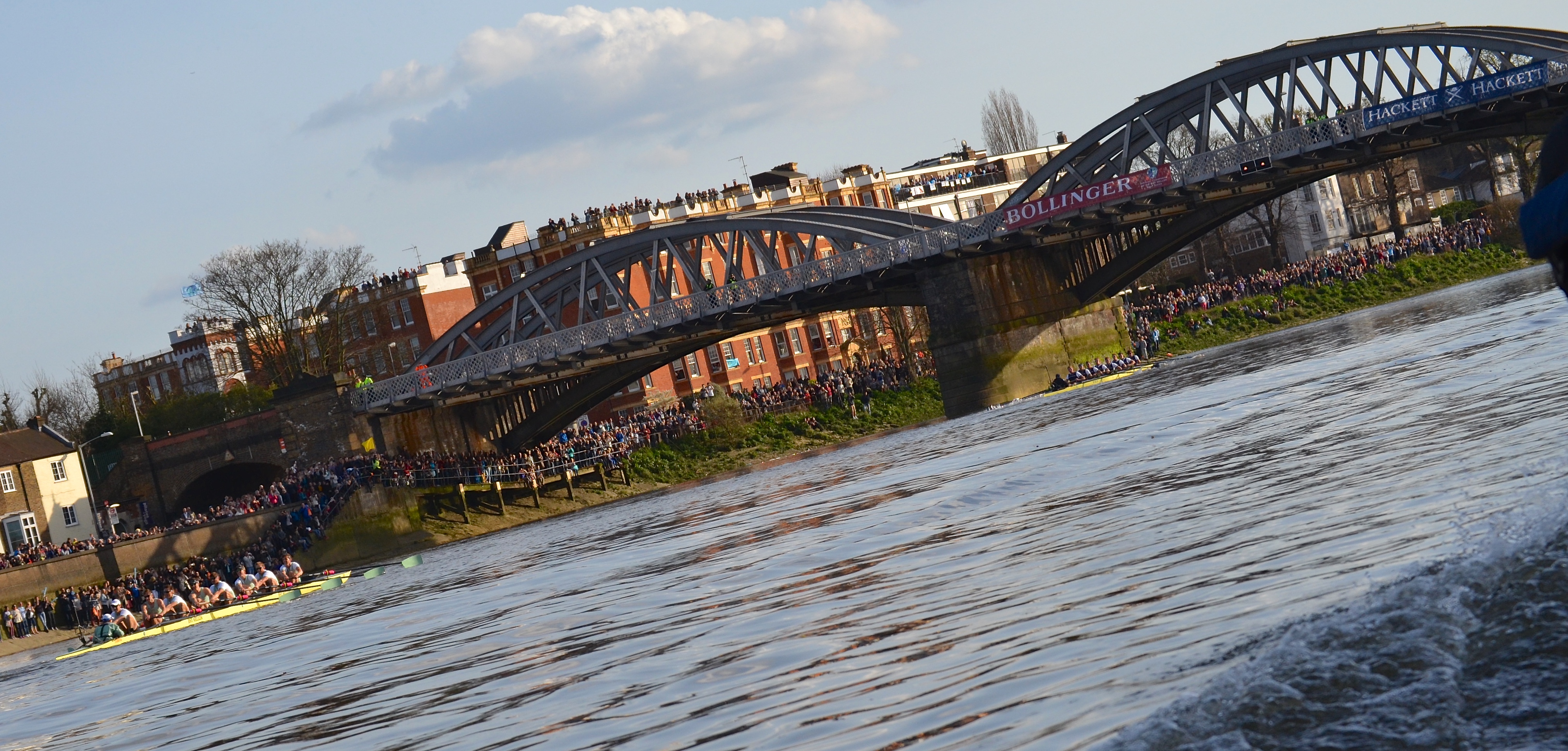 An hour after the women’s race, I followed the men’s race aboard the press launch Majestic. Cambridge had won the toss and chosen the favoured Surrey station. They were not quite straight when umpire Boris Rankov (who holds the record of six consecutive wins for Oxford) started the race. They had a little wobble while Oxford were right on the button. Soon we were dip-and-bucketing spray into camera lenses as the race exploded. Cambridge’s Ian Middleton did his best to push Oxford far toward the Middlesex shore and off the best of the tide. It was a close and hard to Hammersmith, with Oxford clocking one second advantage at the Mile and Hammersmith Bridge. Cambridge were in the lead passing the end of the boathouses in Putney, though from our position hard to Surrey, it was hard to tell who was a seat or two up.