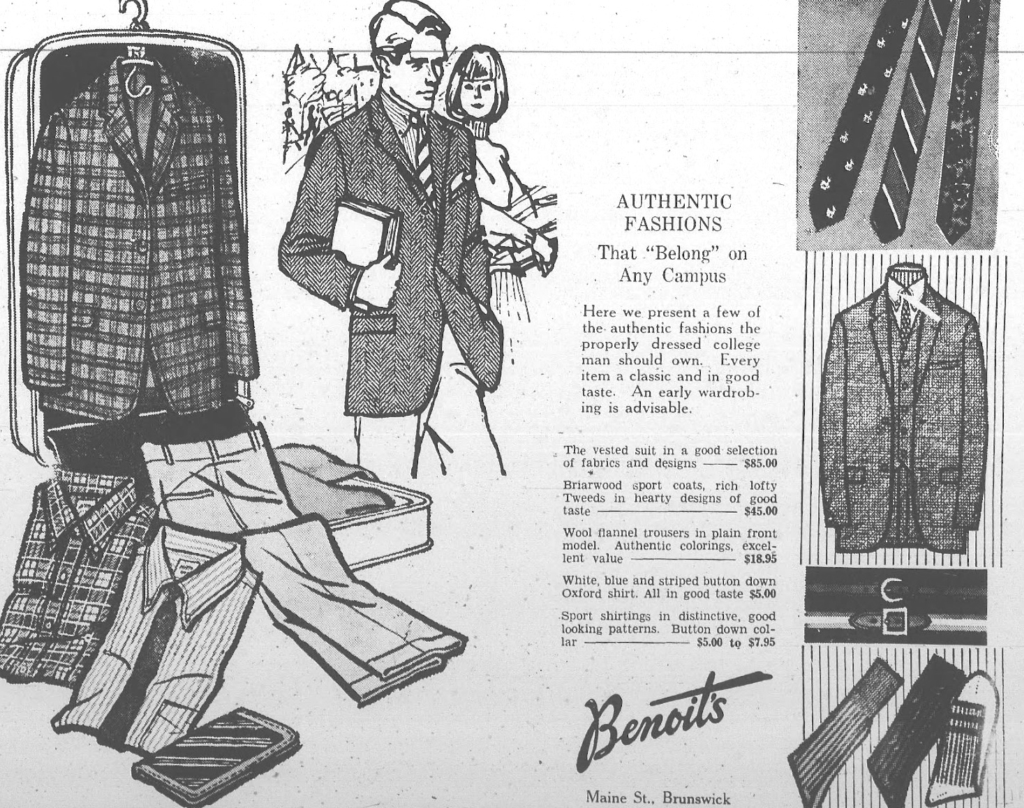 One of the non-rowing blogs that I read regularly is Ivy Style. New York City based ‘Founder and Editor-in-Chief’ Christian Chensvold writes about ‘Ivy League’ clothing, a style of dress that I am particularly fond of. It dominated American fashion from the post-war period until the early 1960s and was most famously merchandised by the Brooks Brothers stores. Students going to college after the 1939-1945 War, (many from less wealthy backgrounds but assisted by the ‘G.I. Bill’) adopted what was then thought of as a very casual style of dress but which, by today’s standards, is anything but informal. Trousers (‘pants’) were ex-army flat fronted khakis (‘chinos’) and lace up shoes were abandoned in favour of slip on leather ‘loafers’. Much clothing was originally from Britain but was often reinvented to be made more comfortable – as when shoulder padding was removed in favour of ‘natural shoulders’. Scotland provided jackets in Harris tweed and crew neck sweaters in Shetland wool. Stiff shirts were replaced by ones of comfortable ‘Oxford’ cloth with soft, button down collars. In the late 1950s, nearly three quarters of all suits sold in the U.S. were in the Ivy League style but, with the coming of the 1960s, its popularity with young people died out within a few short years. Freshmen, who started college in 1963, would quite possibly wear a jacket and tie around campus. By the time they graduated, there was a good chance that they would be wearing jeans and T-shirts.