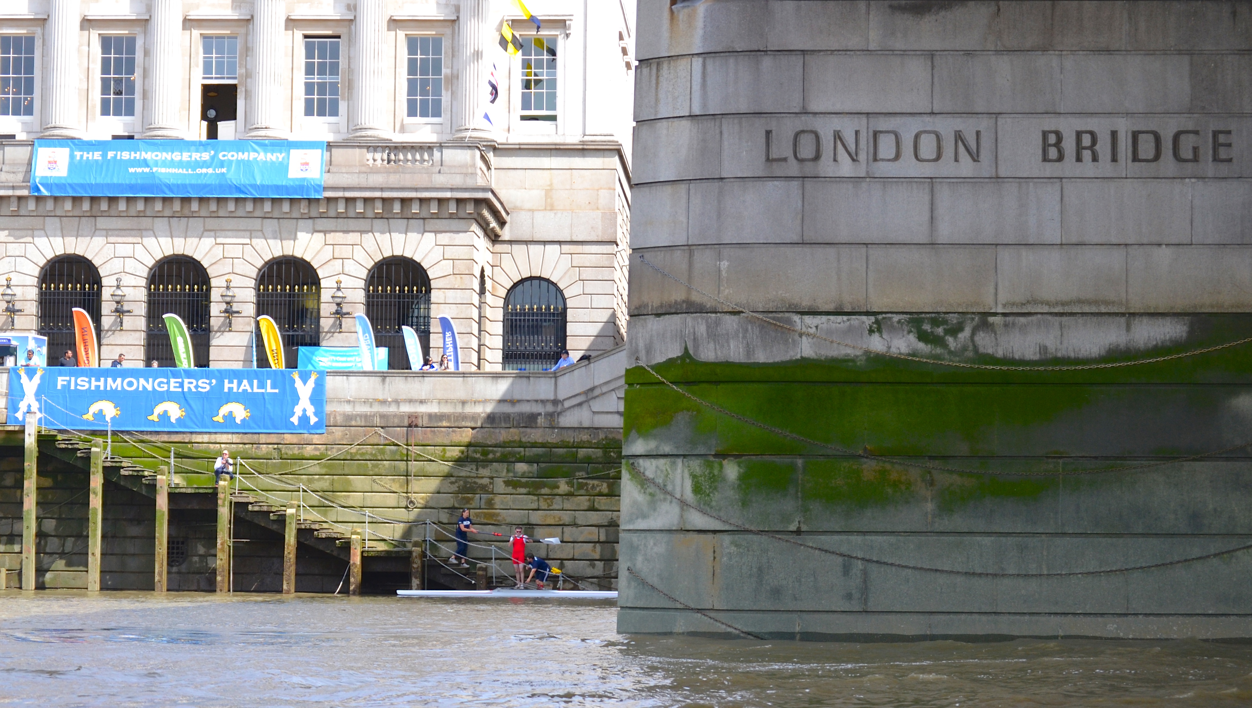 The positions remained similar through the next bridge, Southwark (400 m) but by the Millennium Foot Bridge (700 m) the leading three were still very close but the order was just distinguishable as Pettipher followed by Folkard, followed by Maynard. The latter two started to converge after this point and Flynn struggled as the water became more unsettled.
