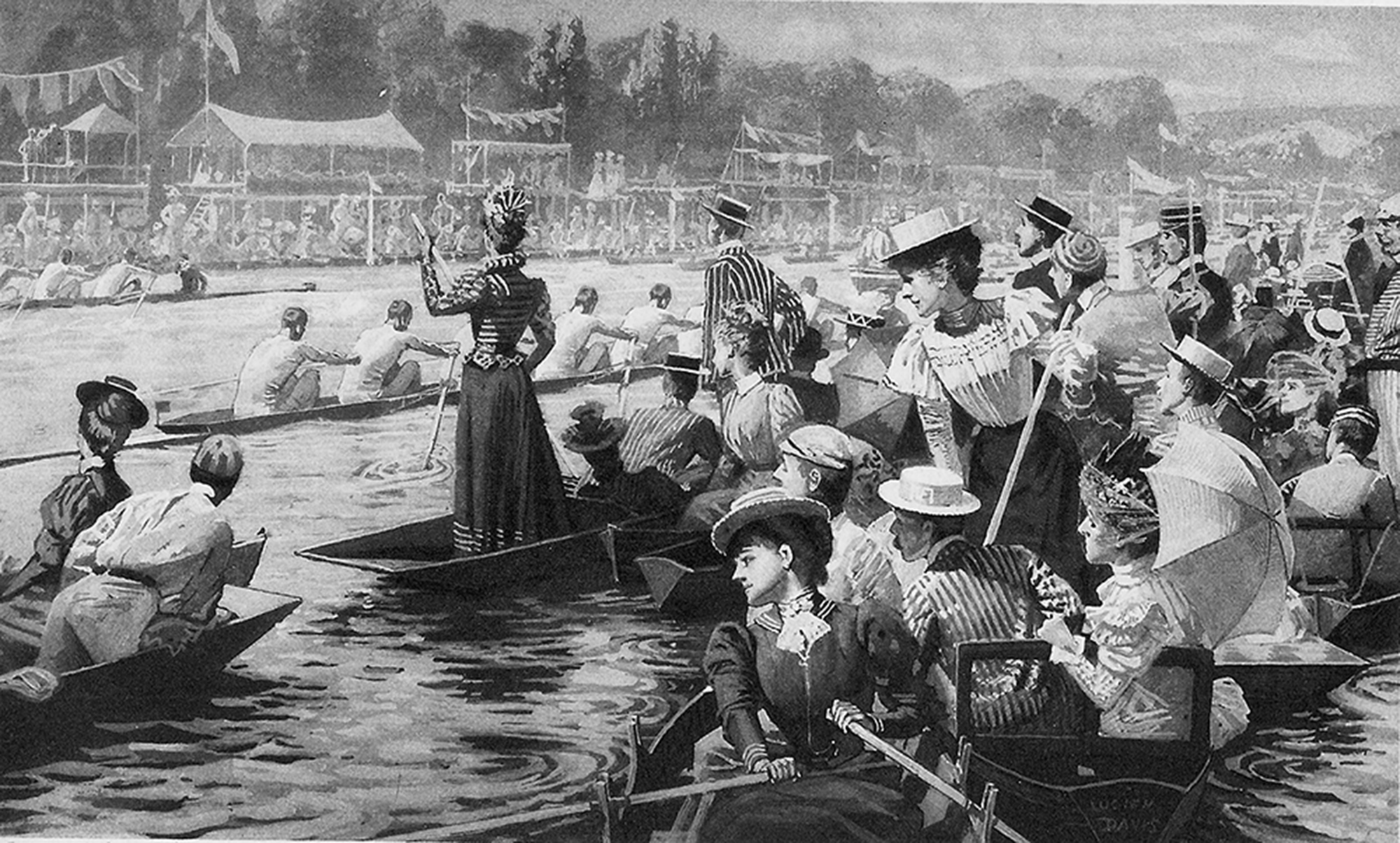By the time of the Cornellians visit to Henley in 1895, many Americans – non-rowers, that is – were drawn to England and to Henley Royal Regatta. To many of these visitors, the regatta was more a social event than a sport competition. One of the reasons for this was that gossip columnists in American newspapers and magazines fed their readers with stories of American upper-class ladies who had married into the English aristocracy and were holding garden parties and social soirees in their new country. Ever since the regatta in Henley had received its Royal patronage in 1851, it had become an event which was visited by the upper-classes which led to further Americans patronizing the regatta, and therefore ‘every year at Henley Regatta the number of houseboats which fly the Stars and Stripes increases’, Henry Wellington Wack wrote in In Thamesland, a book published in 1906 (a quote in the book Victorians on the Thames by R. R. Bolland, 1974).