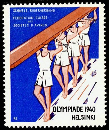 A more striking rowing image from the lost Games of 1940 is the following Cinderella Stamp or Vignette issued by the Swiss Rowing Federation after the Games had been reallocated to Helsinki. I think it is a very beautiful image with lovely straight lines, a simple colour scheme and a classic pose suggesting teamwork on and off the water.