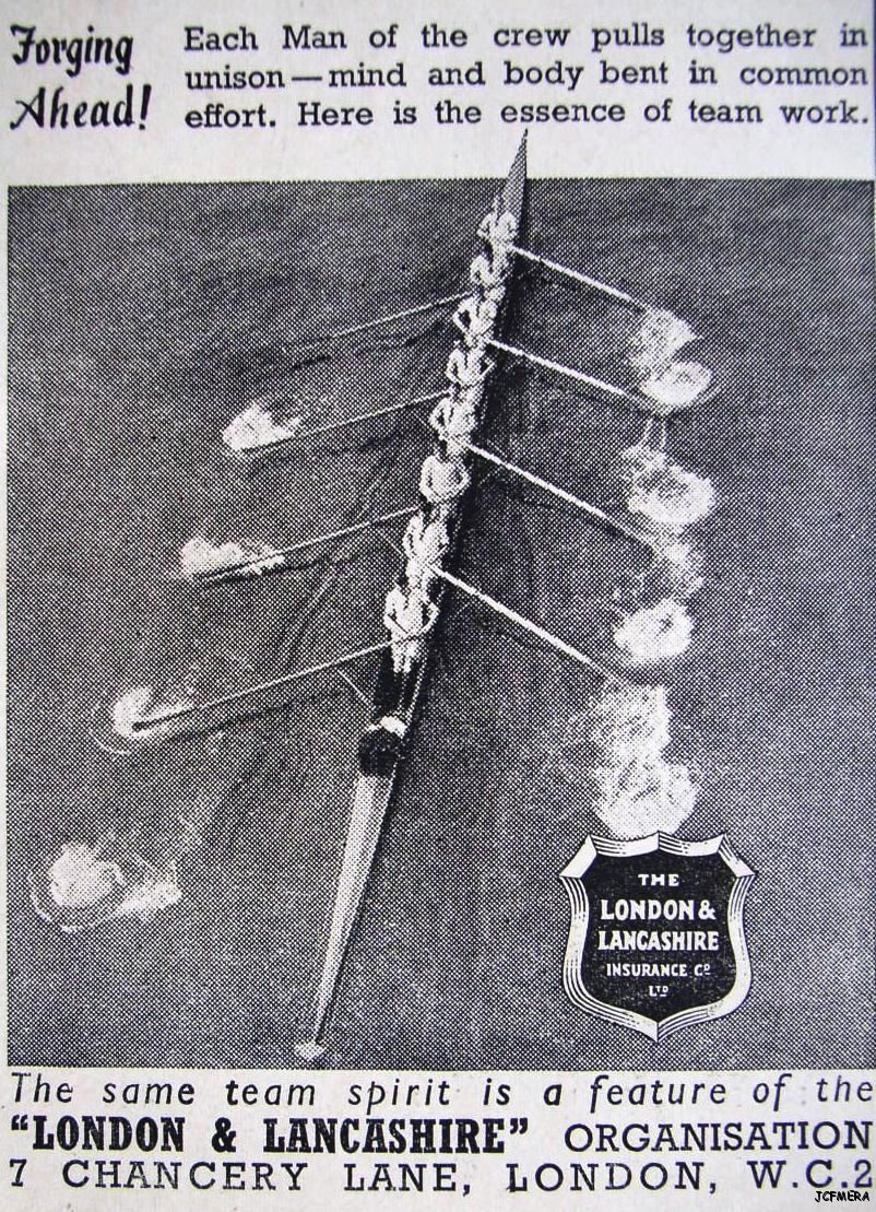 1949: The London and Lancashire Insurance Company ‘pull together in unison – mind and body bent in common effort’.