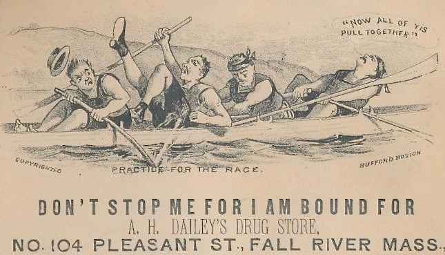 While ‘pulling together’ is much overused, this late Victorian example shows the humorous results of failing to pull together. Perhaps it was also a reference to an impending local regatta?