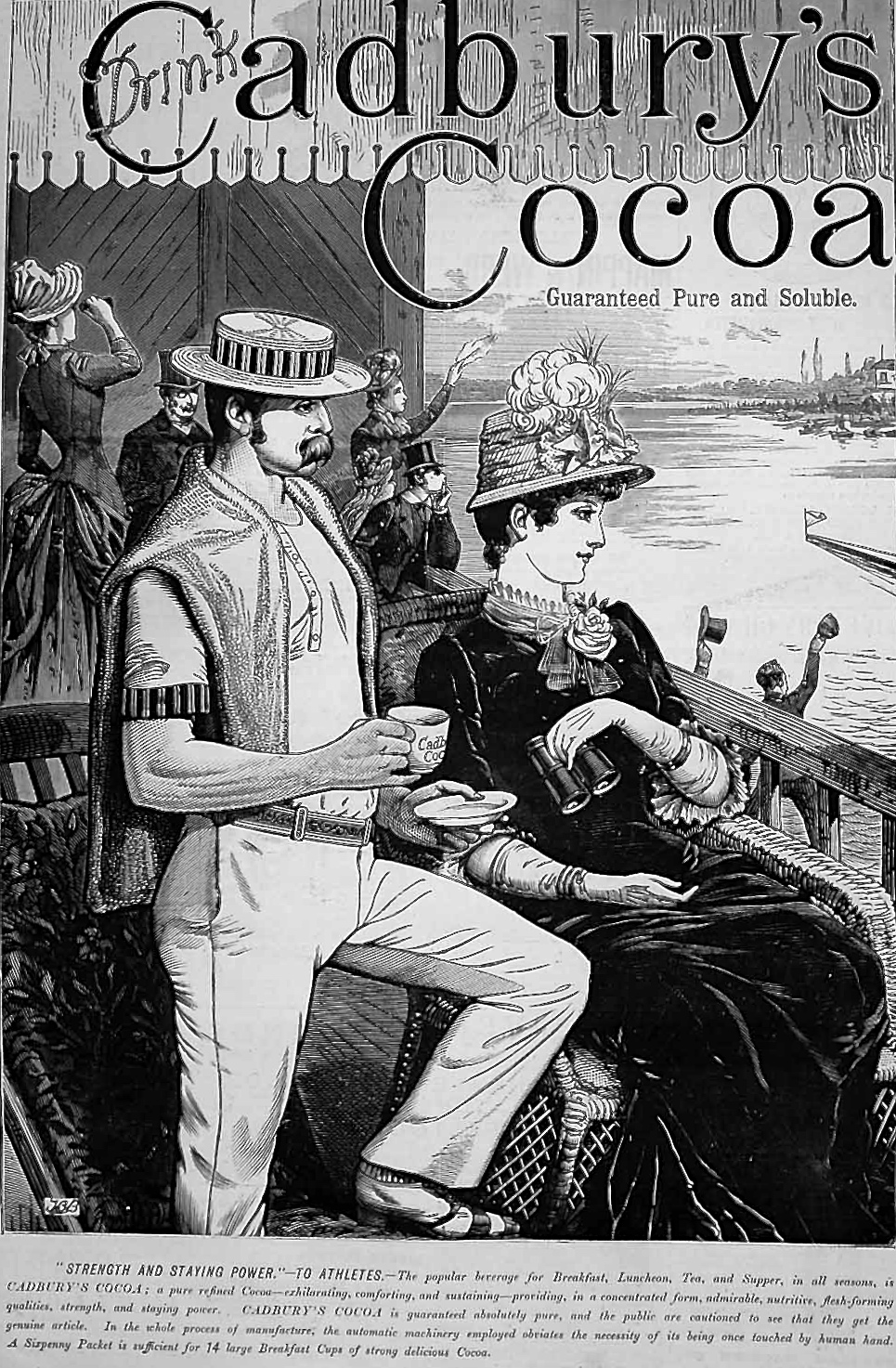 A British ad for Cadbury’s Cocoa dating from 1885. While the text markets it as a drink for athletes needing ‘strength and staying power’, the picture, showing a fashionable Henley type regatta, sells it as something for the wealthy and sophisticated.