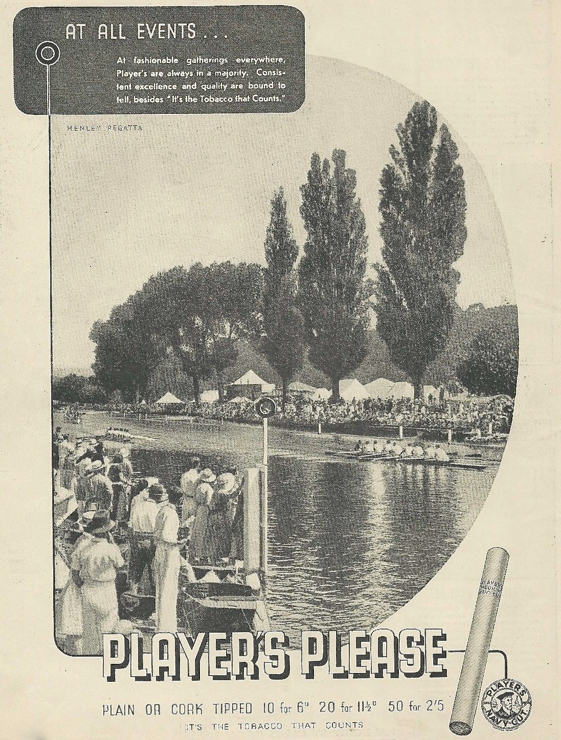 In 1936, sport and smoking could be associated without complaint. This one shows Henley Royal Regatta, one of the ‘fashionable gatherings’ where Player’s cigarettes ‘are always in a majority’.