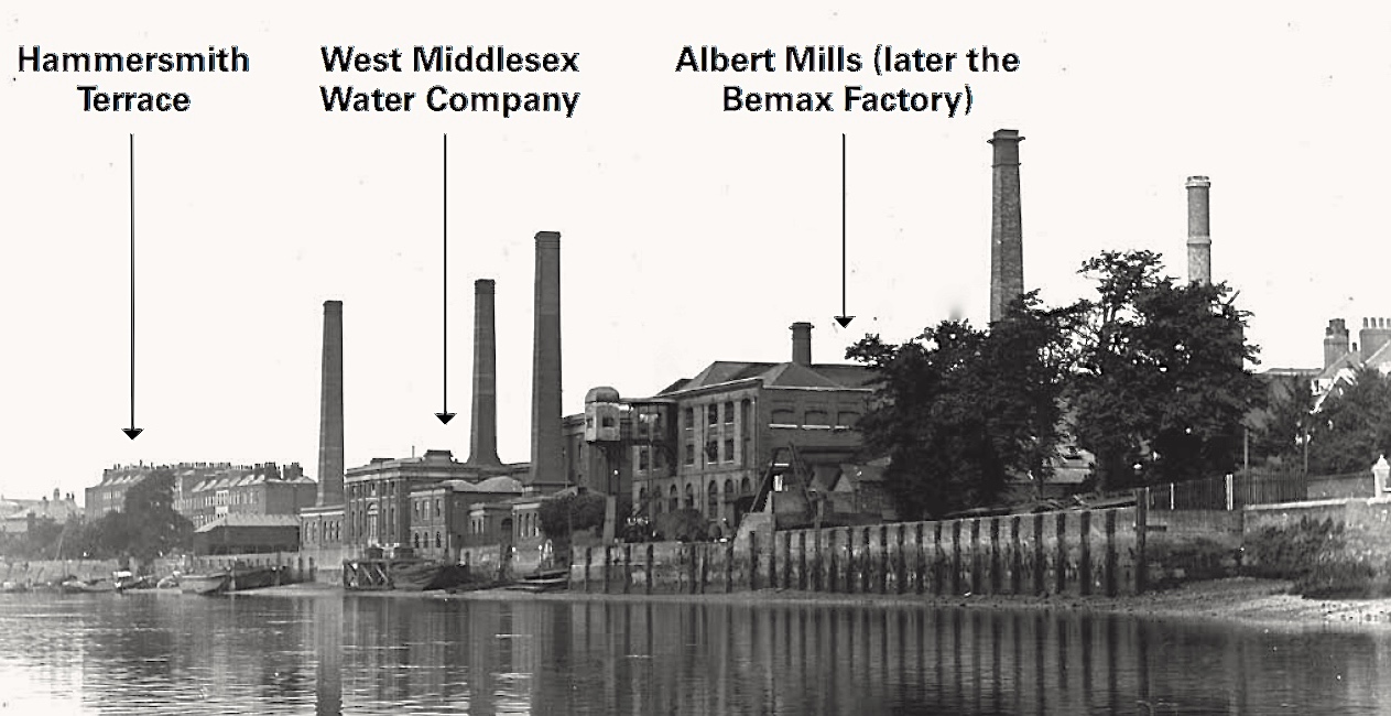 It seems that anyone who rowed in the vicinity of Hammersmith between 1930 and the mid-1970s will distinctly remember the smell produced during the manufacture of Bemax. Hammersmith Mall (or Upper Mall and Lower Mall as the Hammersmith riverfront area is sometimes divided as) is today a desirable and expensive place to live. The western end of the Mall was fashionable for part of the 17th and 18th centuries and some fine houses still exist from that time – including Kelmscott House, home of William Morris. The eastern end however, remained a quiet country spot with a few pubs and cottages, home to fishermen and boatbuilders, until the 19th century when increasing industrialisation brought polluting manufacturing concerns such as the lead mills at ‘Little Wapping’ (now Furnivall Green) and the oil mills opposite Chiswick Eyot (vegetable oil, not petrochemical oil). It was the Albert Oil Mills buildings that Bemax took over in 1930.