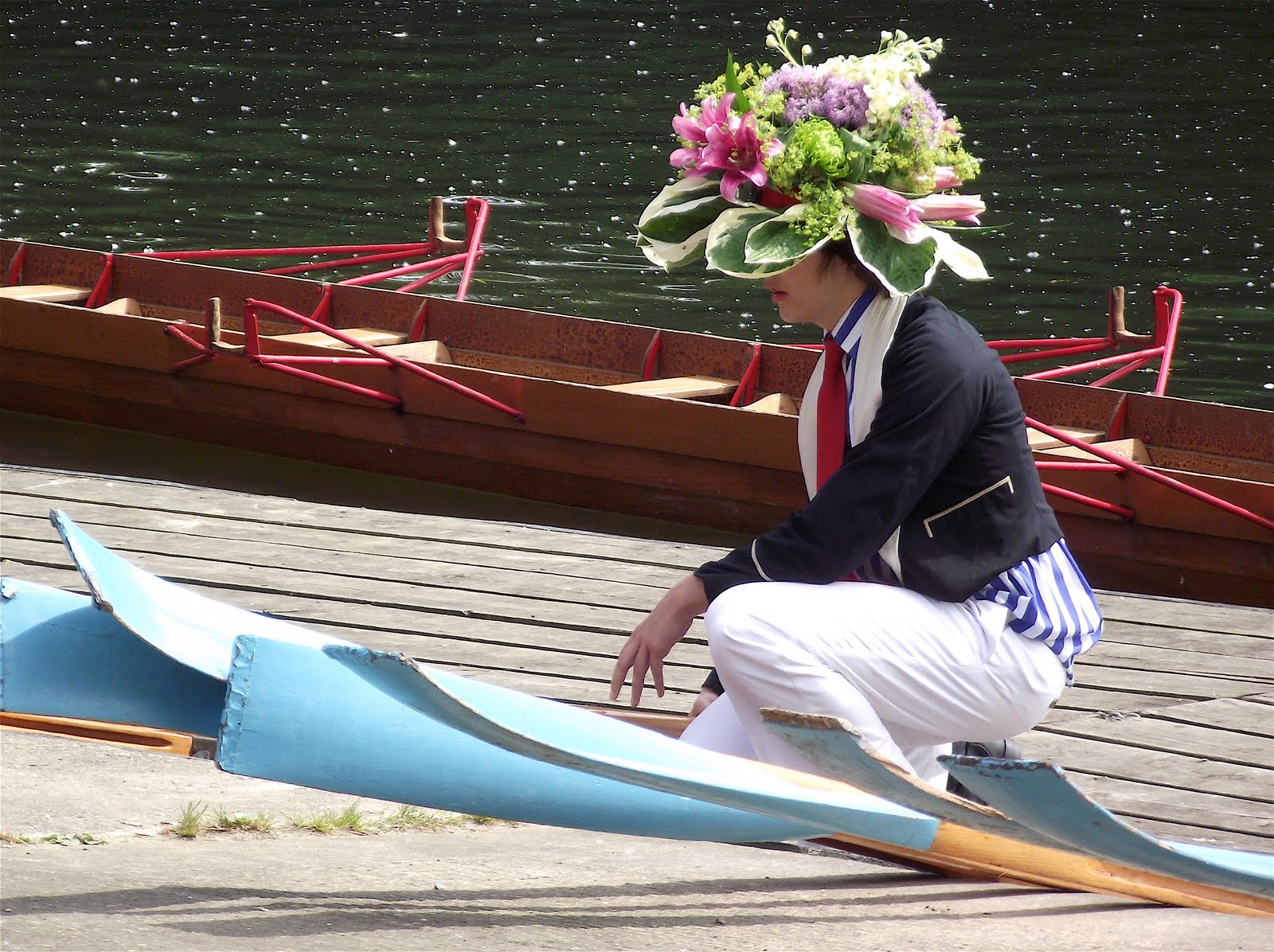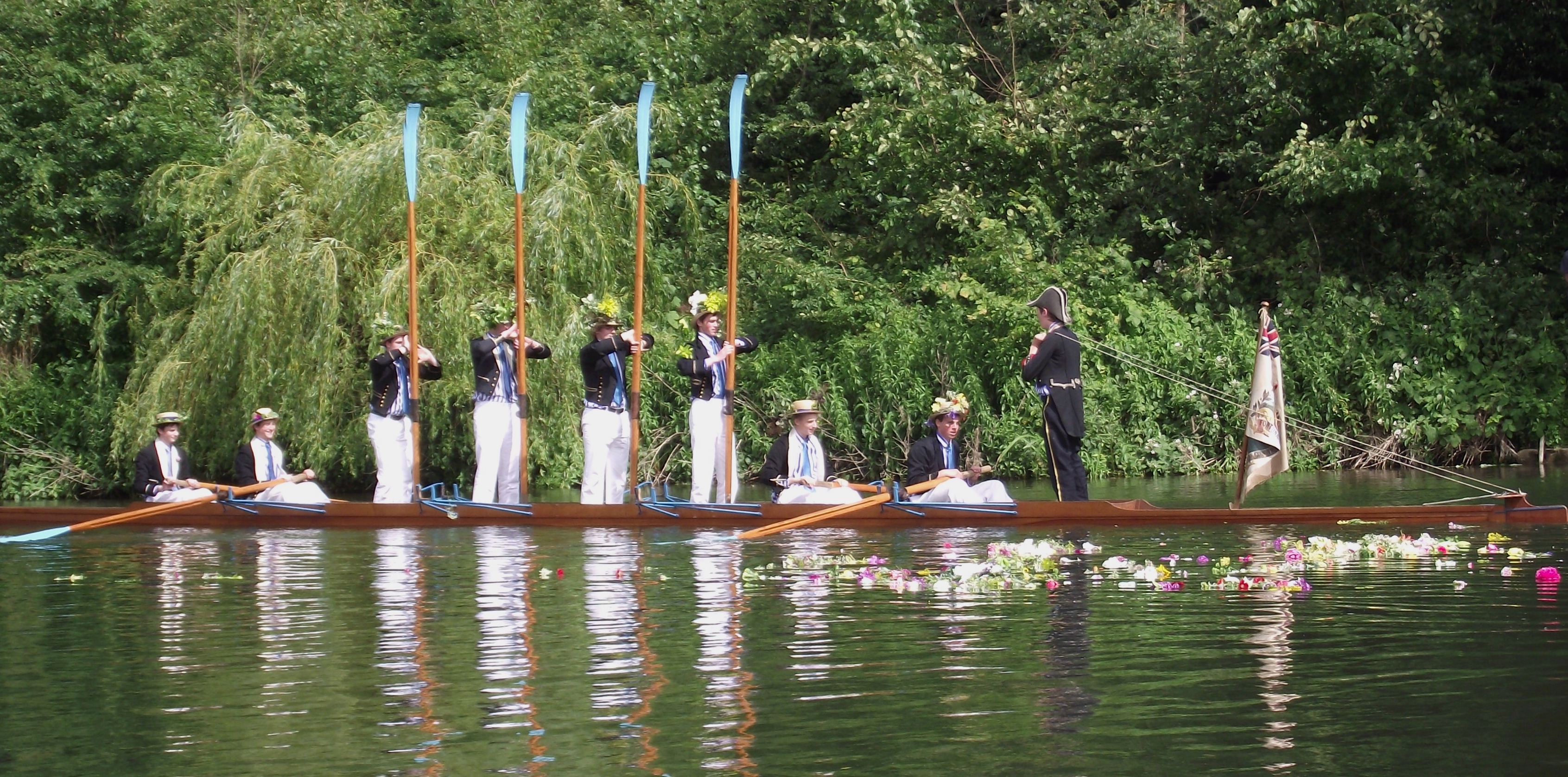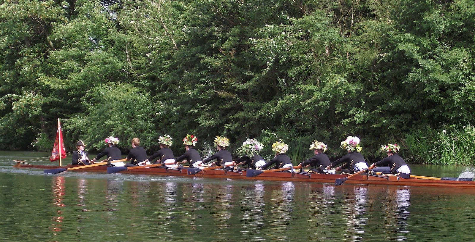 Firstly, the boats are mostly Victorian, all fixed seat, most with ‘fixed pin’ gates (i.e. no swivel rowlocks) and the leading boat is a ‘ten-oar’. The oars have ‘needle’ spoons and, naturally, boats and blades are all made from wood. The next oddity is that the rowers are dressed in the uniform of eighteenth-century midshipmen, with the cox dressed as an admiral or other senior naval officer. Most strikingly, the oarsmen wear straw boaters extravagantly decorated with fresh flowers. Finally, at a certain point in the row past, each boat stops in turn and the entire crew and the cox stand up. Those in boats with open fixed pin gates then hold their oars erect. This is not easy, but they are assisted by the fact that Victorian eights are more stable than modern racing boats. They then face Windsor Castle, remove their hats and cheer the Queen and the memory of George III, shaking the flowers from their boaters into the water. The crew then resume their seats and row off out of sight. Film evidence from 1938 of these unlikely happenings is on the ever reliable Pathé Newsreel site here.