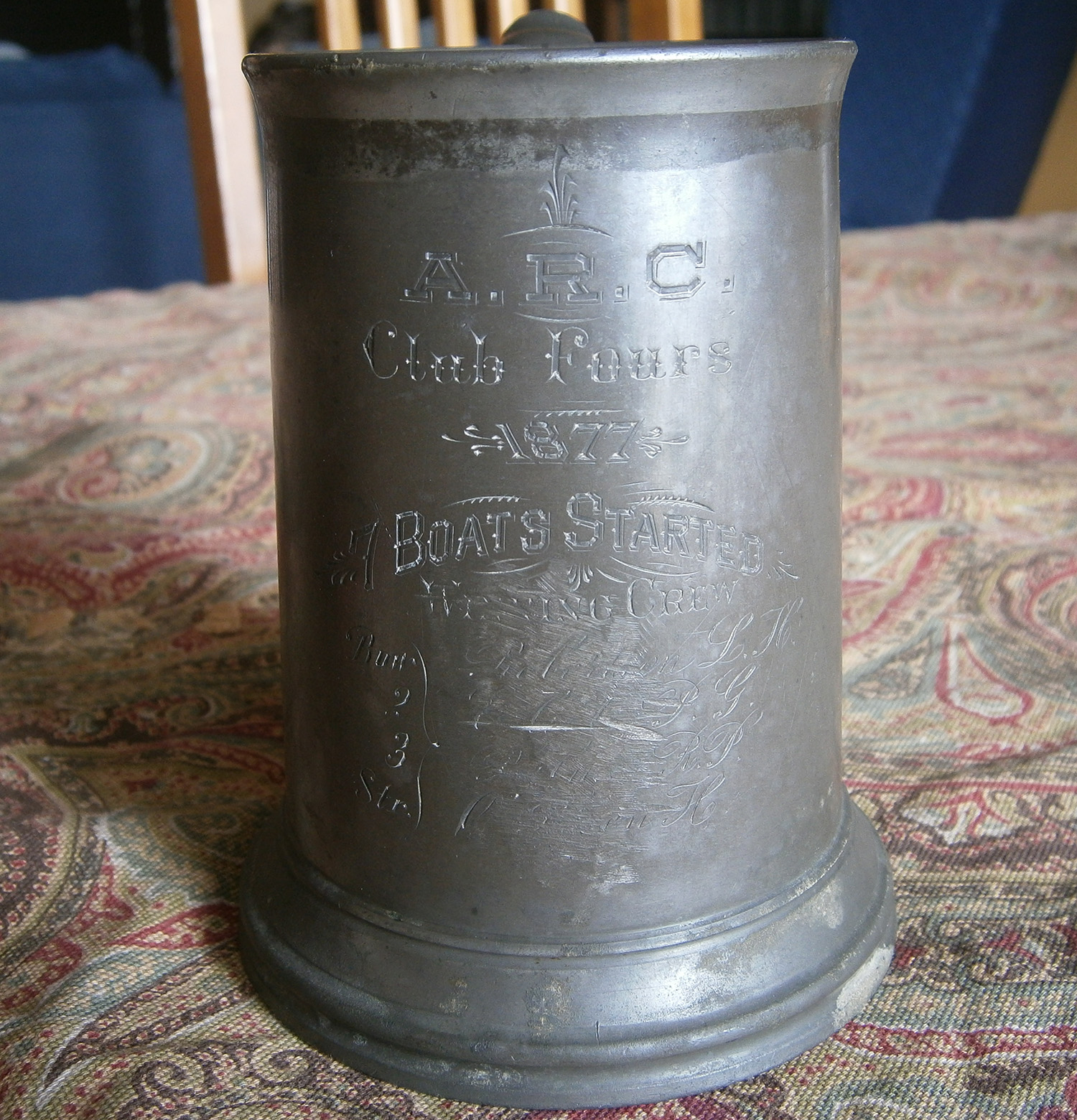 ‘It is a James Dixon & Sons 482 pattern mug and is engraved with the following: “A.R.C. Club Fours, 1877, 7 Boats Started, Winning Crew…” Then unfortunately someone has all but obliterated the names. Although they have been scratched, we can make out the following: Bow – Robertson, L.H. #2 – [surname scratched] E—-, P.G. #3 – [surname scratched] —-, R.P. Str. – [surname scratched. possibly O’Brien (?)] H.’