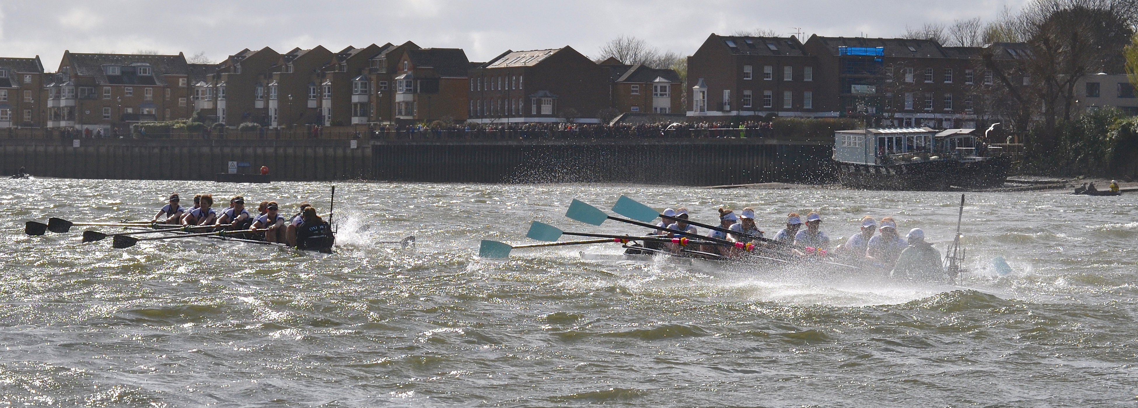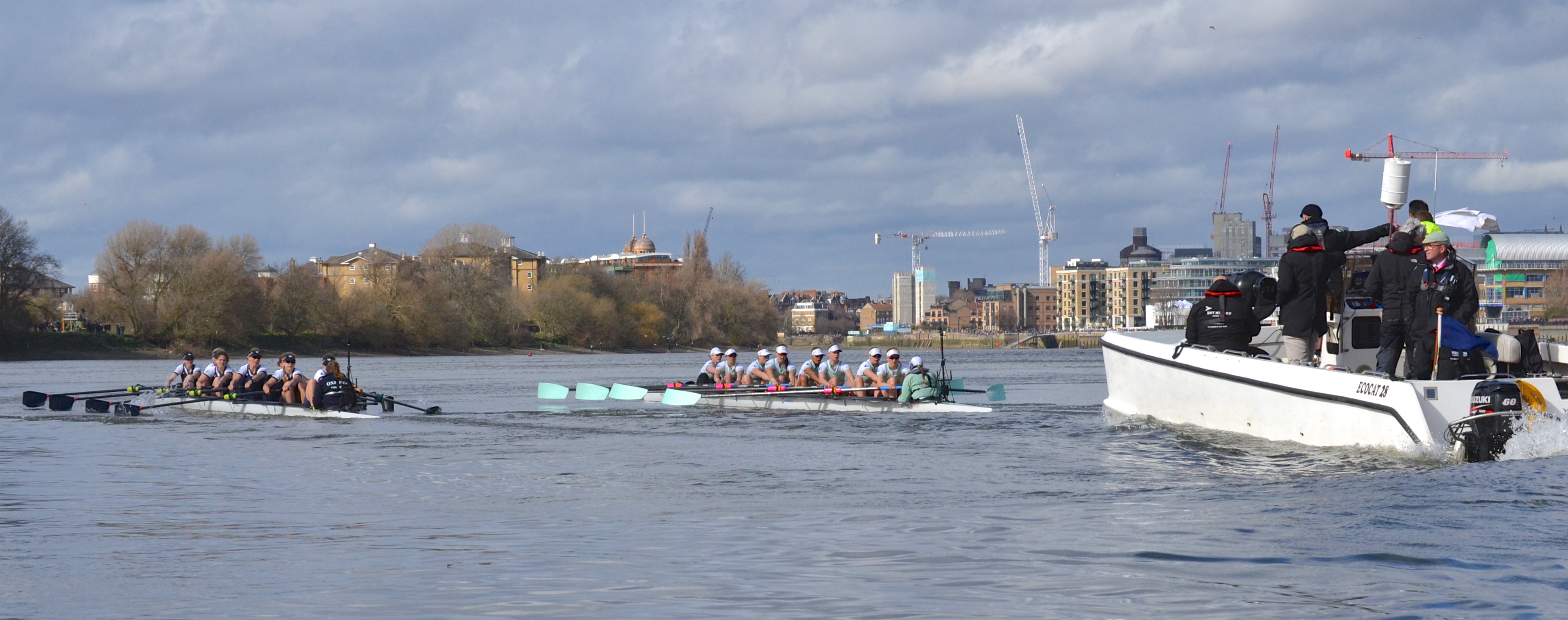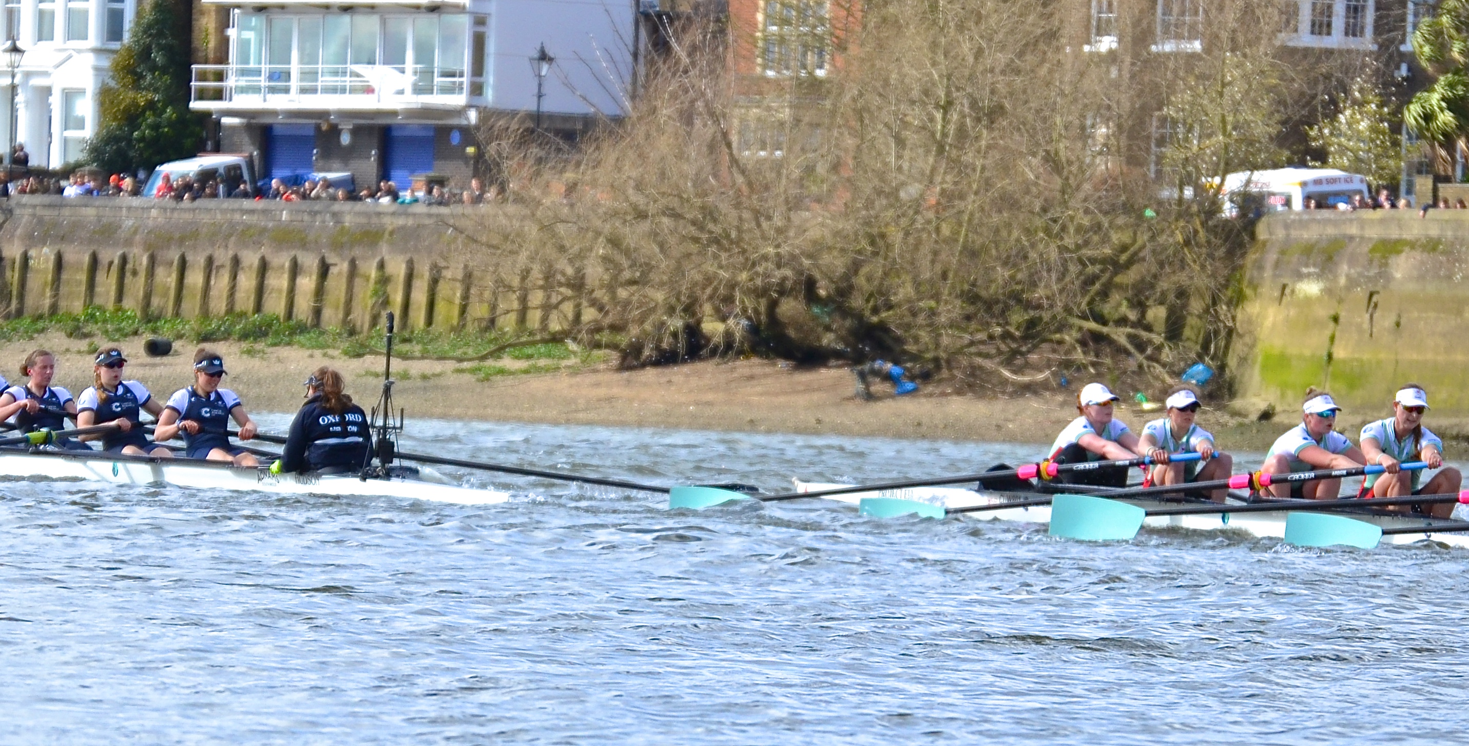 A few strokes into the 2016 Women’s Boat Race with Oxford on the left (Surrey station) and Cambridge on the right (Middlesex station). For those unfamiliar with the 4 1/4 mile/6.8 km course, a map is here.