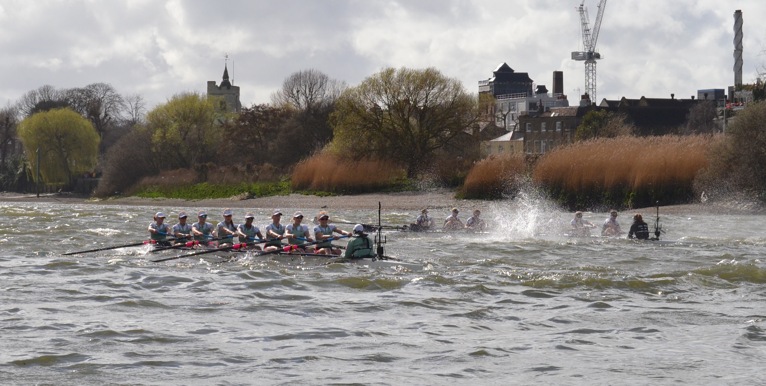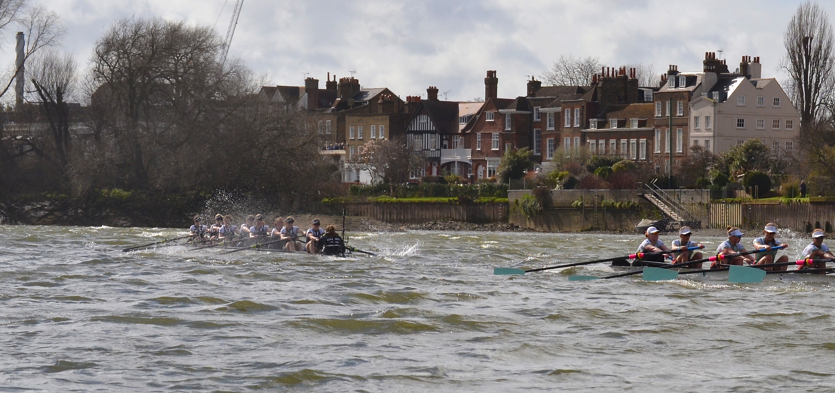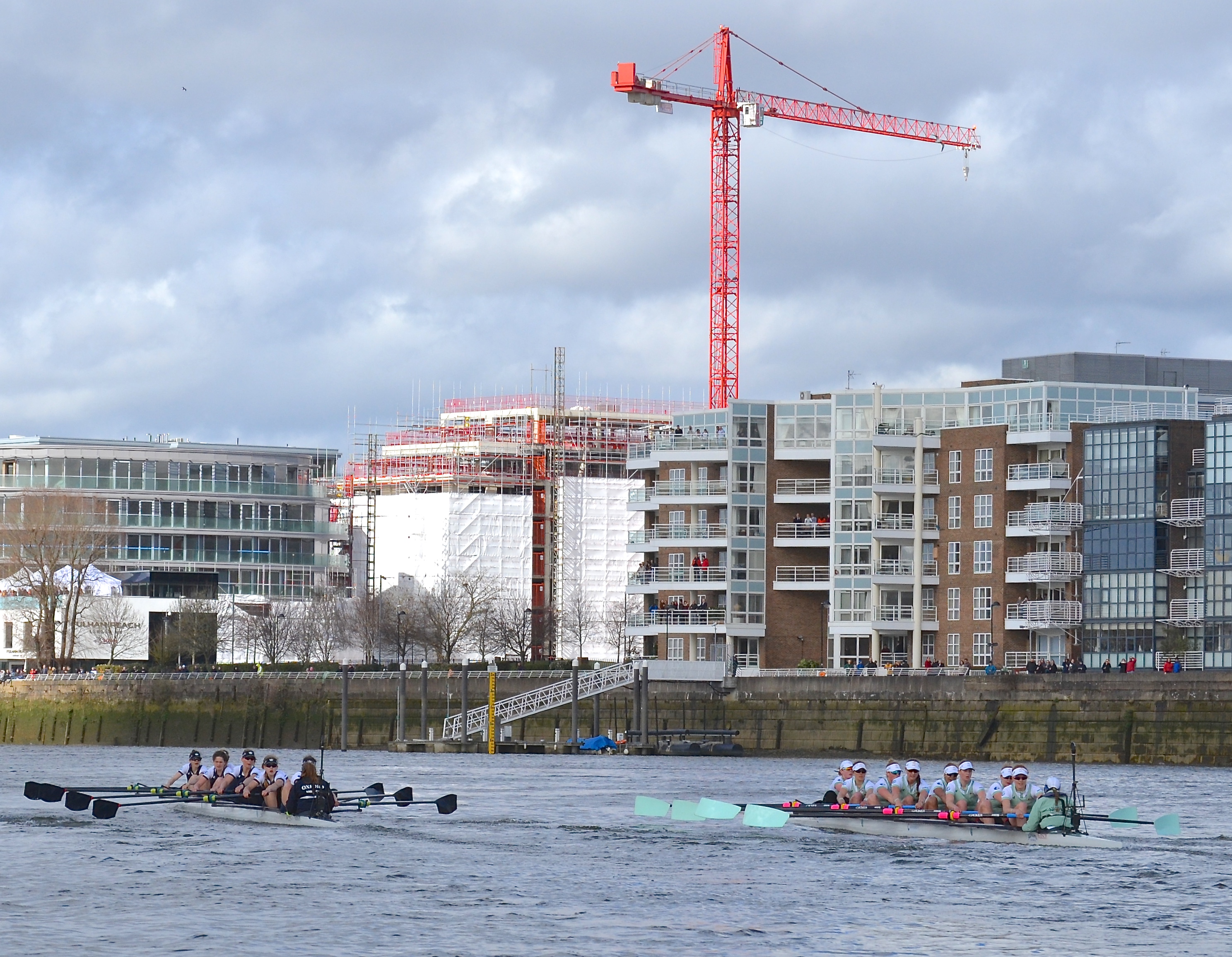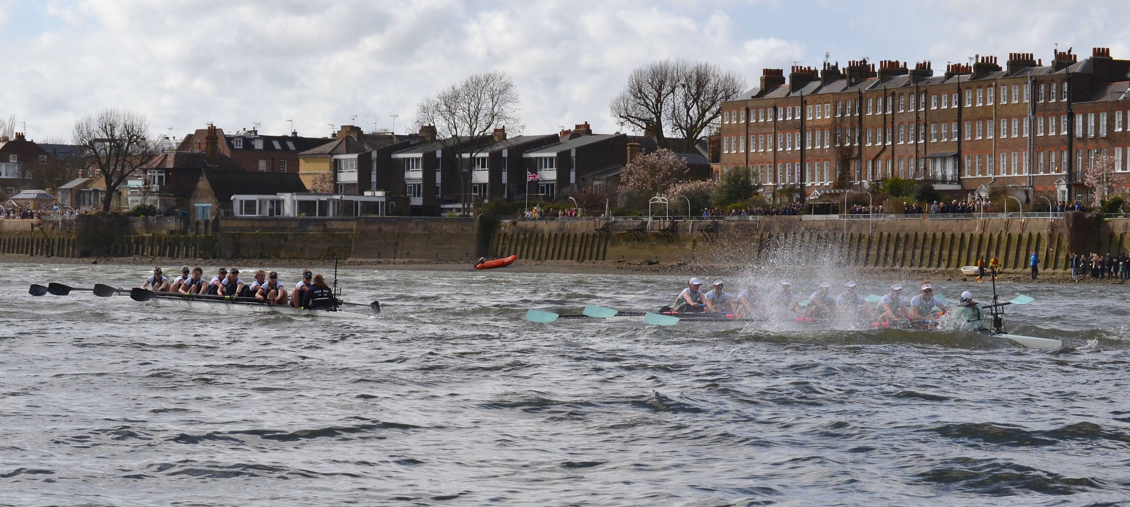 A few strokes into the 2016 Women’s Boat Race with Oxford on the left (Surrey station) and Cambridge on the right (Middlesex station). For those unfamiliar with the 4 1/4 mile/6.8 km course, a map is here.