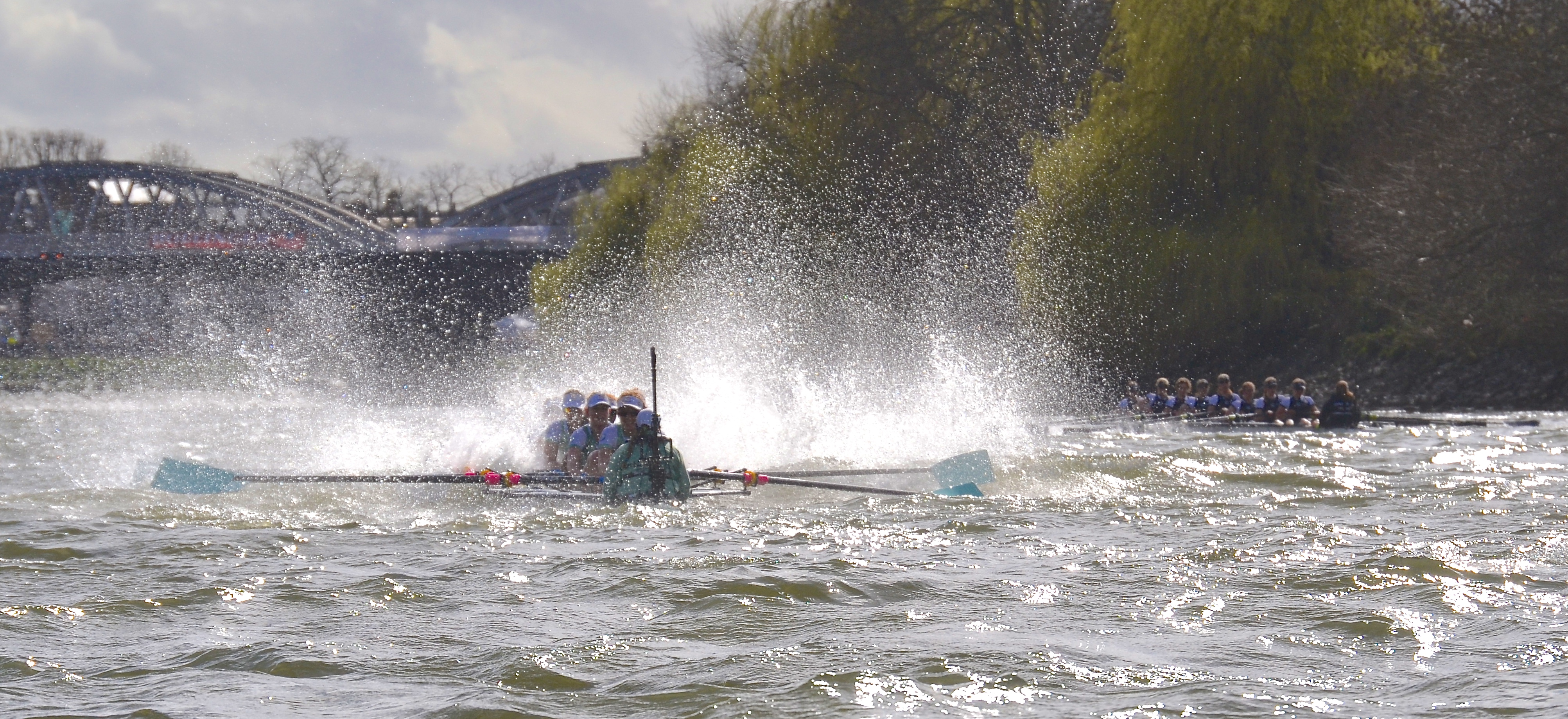 Cambridge took the initial lead when Oxford had a bad start but, by the end of Putney Embankment, the Dark Blues had started to inch ahead. Pictured here at two minutes and thirty five seconds into the race (henceforth referred to in the style ‘+ 2 min 35 sec’) and approaching Barn Elms, Cambridge, rowing at a higher rate, were warned for trying to push Oxford out.+ 3 min 08 sec: Both coxes steered well, the parallax error inherent in photographing from behind and to the side here making Oxford look further ahead than they were. The Dark Blues were four seats up at the Mile Post but both crews were given a time of 4 min 13 sec.+ 5 min 28 sec: At this point, Oxford were six seats up and, as the crews approached Harrods, just downstream of Hammersmith Bridge, they had stretched out their lead to around three quarters of a length.+ 7 min 03 sec: At Hammersmith Bridge, Oxford led by just two seconds and Cambridge continued to maintain an overlap (despite what this picture appears to show).+ 8 min 18 sec: Passing Dove Pier, opposite St Paul’s School, Cambridge clung on, still overlapping as Oxford struggled to get away.+ 8 min 30 sec: Approaching Latymer School Boathouse, the blade of Cambridge’s ‘2’ came unnervingly close to that of the Oxford stroke (though the long camera lens exaggerates this).+ 9 min 49 sec: The blue window above the head of Oxford’s ‘3’ marks the mid-way point. At the top of the Hammersmith bend, Cambridge, on the worse station and rowing in Oxford’s puddles, began to fall back as the conditions ‘got Biblical’. ~ Matthew 8:24. And behold, there arose a great storm on the sea, so that the boat was being covered with the waves……+ 10 min 13 sec: Below Chiswick Eyot, Oxford cox Morgan Baynham-Williams decided to steer for calmer water beside the little island and switched stations to Middlesex.+ 10 min 45 sec: Alongside the Eyot, Baynham-Williams found that her bold move did not give her the advantage that she had hoped for and Cambridge, in the faster water, closed the gap. However, in the prevailing conditions, it was not possible for them to capitalise on Oxford’s mistake and make a ‘big move’. ~ Isaiah 54:11. O afflicted one, storm-tossed, and not comforted…..+ 11 min 18 sec: At the top of the Eyot, Baynham-Williams returned to the Surrey station, bravely or foolishly cutting closely across the Cambridge bow.+ 11 min 28 sec: By this stage it was clear that Cambridge had taken on a lot of water and that Oxford had better adapted to the extreme conditions. The times to Chiswick Steps were Oxford 12 min 39 sec, Cambridge 12 min 47 sec. ~ Psalm 69:14. Deliver me from the mire and do not let me sink; May I be delivered from my foes and from the deep waters.+ 13 min 43 sec: From above the Eyot, Oxford started to pull away and had a two-length lead at Chiswick Pier.+ 14 min 26 sec: Above Chiswick Pier, another dramatic and risky move from Oxford, then three lengths up, as Baynham-Williams made the brave decision to head for the Middlesex bank, gaining shelter but losing the stream. ~ Psalm 55:8. I would hasten to my place of refuge from the stormy wind and tempest.+ 15 min 06 sec: It was a move that worked as Oxford, in calmer waters, regained their rhythm and drew away from Cambridge who were still looking for stream in mid-river and taking on water faster than their pumps could cope with. ~ Ezekiel 36:25. Then will I sprinkle clean water upon you, and ye shall be clean: from all your filthiness, and from all your idols, will I cleanse you.+ 15 min 22 sec: Below Barnes Bridge, Oxford continued to draw away. Oxford reached the bridge in 17 min 55 sec, Cambridge in 18 min 33 sec.+ 18 min 42 sec: Above Barnes Bridge, Cambridge were clearly in serious trouble with their hull barely visible, but modern rules on buoyancy mean that the swamped boat was just about rowable. ~ James 1:12 Blessed is the one who perseveres under trial…..+ 19 min 41 sec: Above Barnes Bridge the following flotilla was held back and Umpire Rob Clegg offered Cambridge the option to stop (my view of this was blocked by the umpire’s launch). Cox Ostfeld refused it, moved to the Middlesex bank and, as her crew reached calmer water, the pumps began to empty the boat of water and they were able to row to the finish. ~ Matthew 20:16. So the last will be first, and the first last.+ 21 min 30 sec: With Oxford (in the distance, on the far left of the picture) just about to cross the winning line, Cambridge struggled on to finish over a minute later. The finish times were Oxford 21 min 49 sec and Cambridge 23 min 00 sec, but this result should not cause us to forget what a good and close race it was before the conditions got ‘insane’ and Cambridge came off worse. ~ Timothy 4:7. I have fought the good fight, I have finished the course, I have kept the faith….