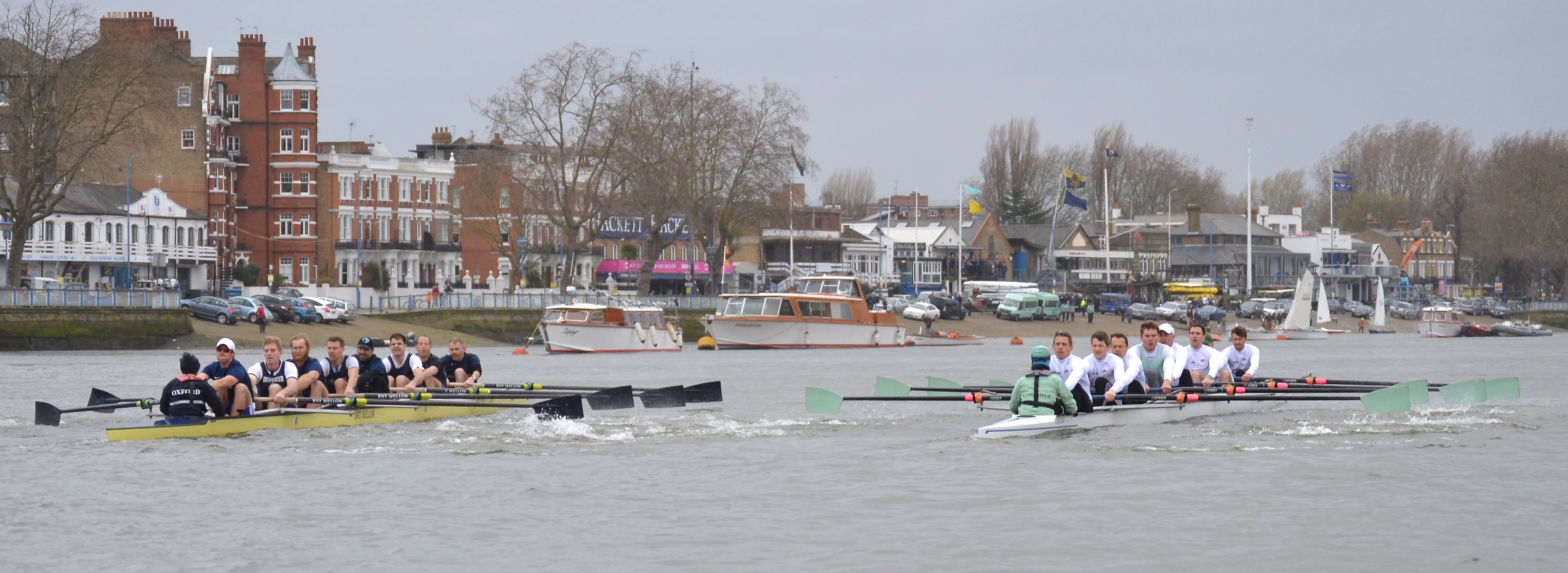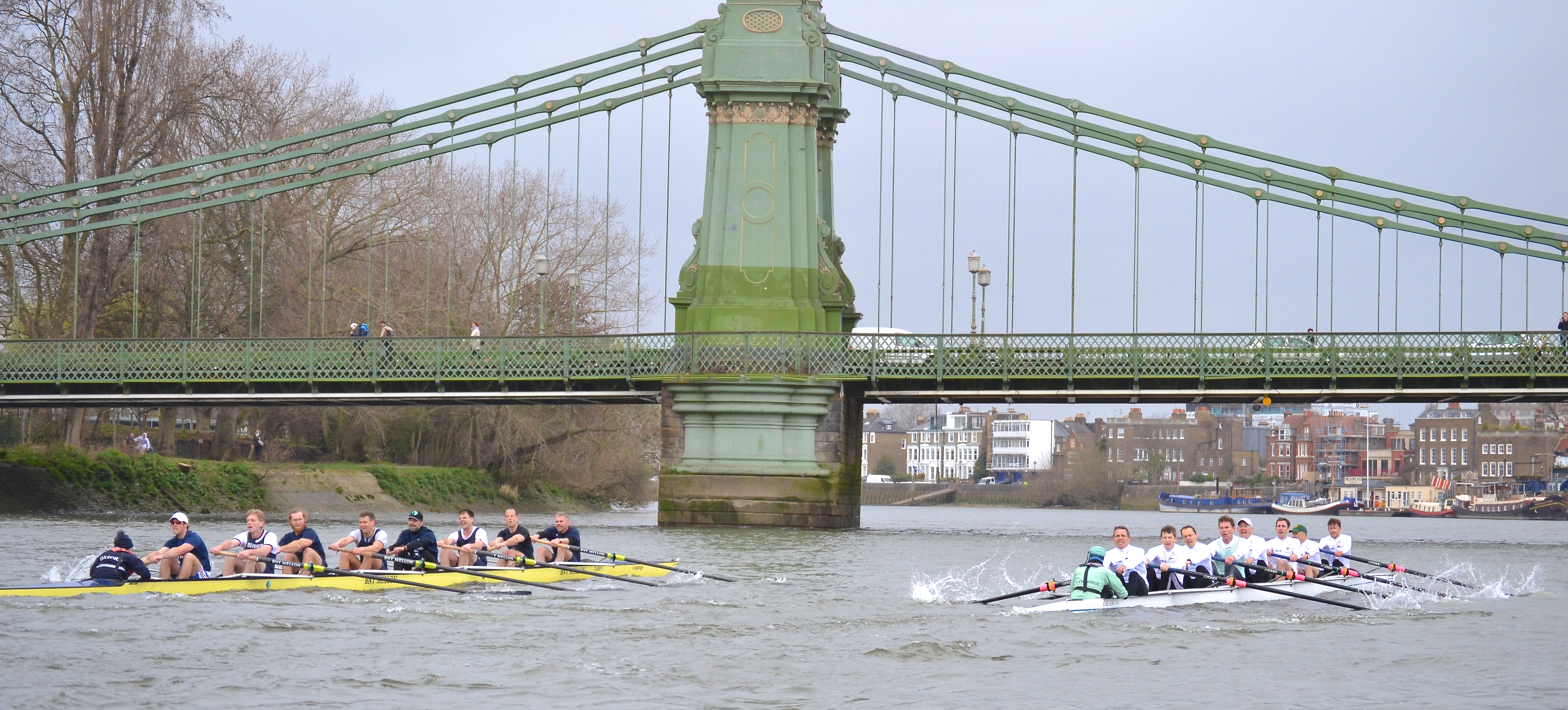 A critical moment came just before the Depositary, when Cambridge were warned not to cut across the corner approaching Hammersmith Bridge, and their resulting steer gave Oxford the chance to push back nearly on terms. Two seats to Cambridge, one seat to Cambridge, more warnings for both crews, a slight touch of the oars as they knitted in and out of each other, and at Hammersmith Bridge it became a flat-out dogfight for the last minute.