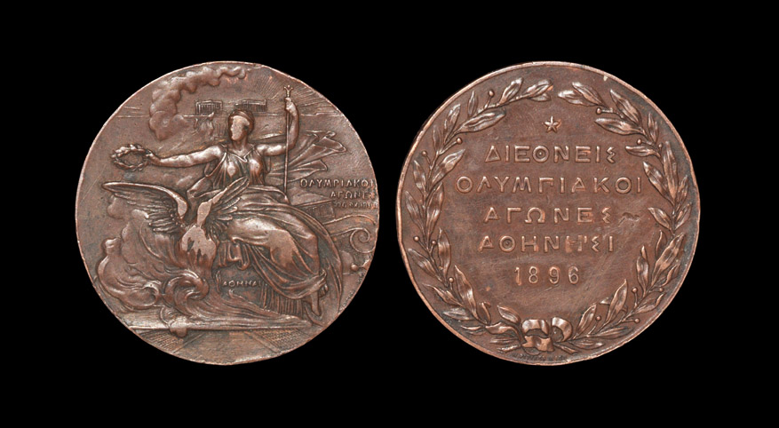 Winners of events in Athens received silver medals (above) with runners-up receiving a bronze version of the same medal. The medal was designed by Jules Chaplin; the obverse is a portrait of Zeus with the globe in his right hand, upon which stands the goddess of victory, Nike, holding an olive branch, to the left in Greek the script reads OLYMPIA. The reverse features the Acropolis and Parthenon; the inscription translated from the Greek reads INTERNATIONAL OLYMPIC GAMES, ATHENS 1896. All participants received a commemorative medal (below).