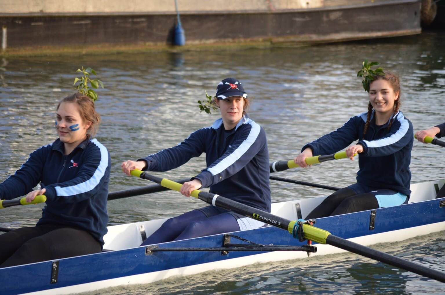 All 18 boats are pushed out into the river ‘tethered’ by a chain held by the cox, and at the sound of a final cannon attempt to close the gap between them and the boat upstream of them before the boat downstream catches up to them, all while navigating the tight bends of the river and trying not to crash into either the narrowboats moored along the course or pairs of boats that have ‘bumped out’ and pulled to the side of the river. Bumping the crew ahead of you means you take their place on the next day of racing. The ultimate aim of every crew and club is to bump all the way to ‘Head of the River’, the boat at the front of the top division. Also coveted is the achievement of ‘Blades’, variously defined across clubs but in most cases defined as bumping up at least one place on each of the four days of racing. Blades are quite rare – the saying is ‘good crews get three bumps, lucky crews get four’ – thus why we were so excited to claim one in Lent Bumps this year.