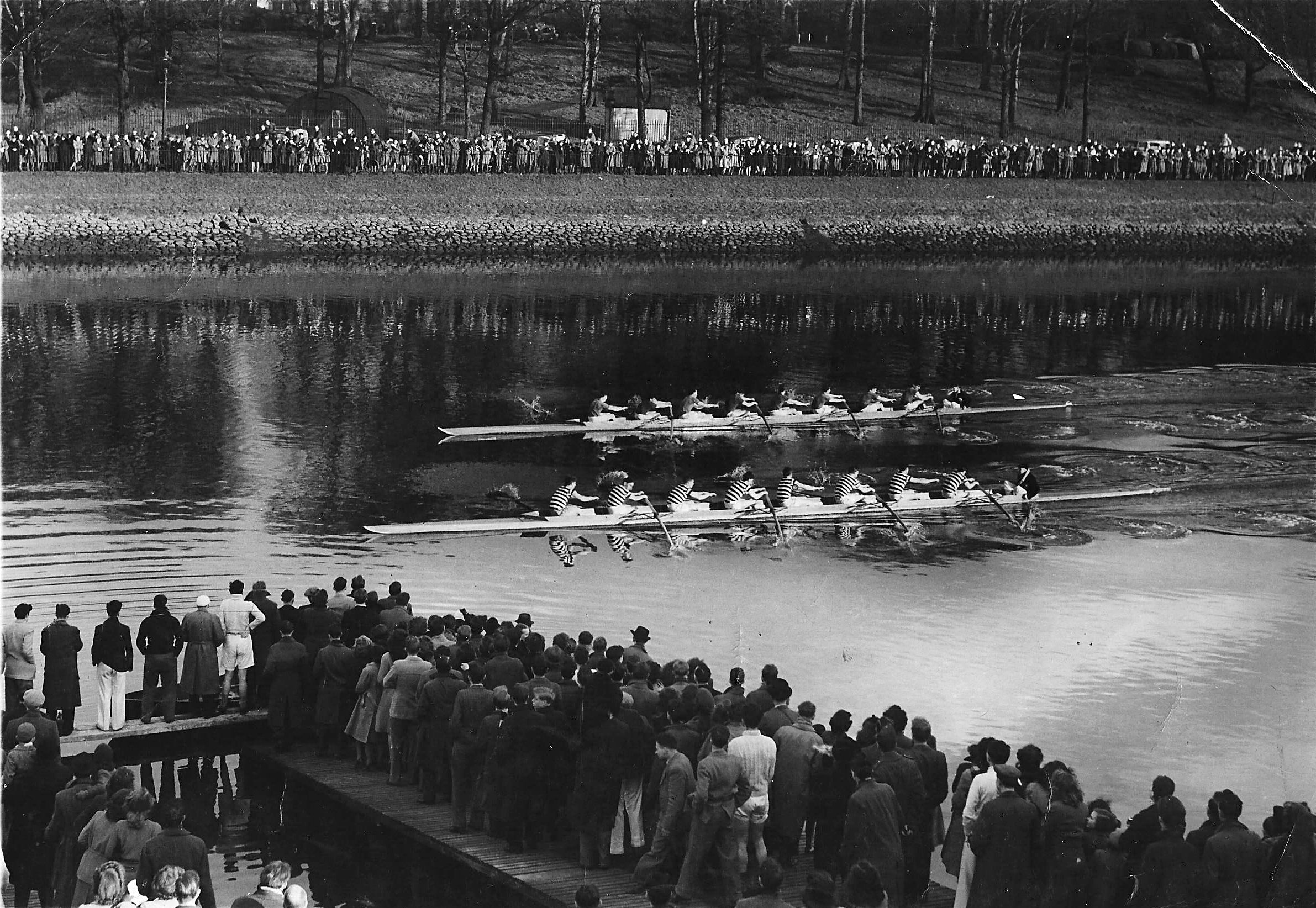 WylieCup0002I’m attaching two photographs of a Wylie Cup match which my father annotated on the back ‘Wylie Cup, Lagan, 1946’ (Lagan implies Belfast, which is situated on that river). My father is at 4 in the picture of what looks like the start (see photograph on top), but careful study of the second, long-shot picture (above) suggests that it’s of a different race. The Wylie was won by Queen’s in 1946, but in that shot, it’s a DUBC crew that is in front, and neither crew looks to be composed of first-class rowers: I wonder if, in fact, the shot is of a different race that same day, perhaps freshmen novices?
