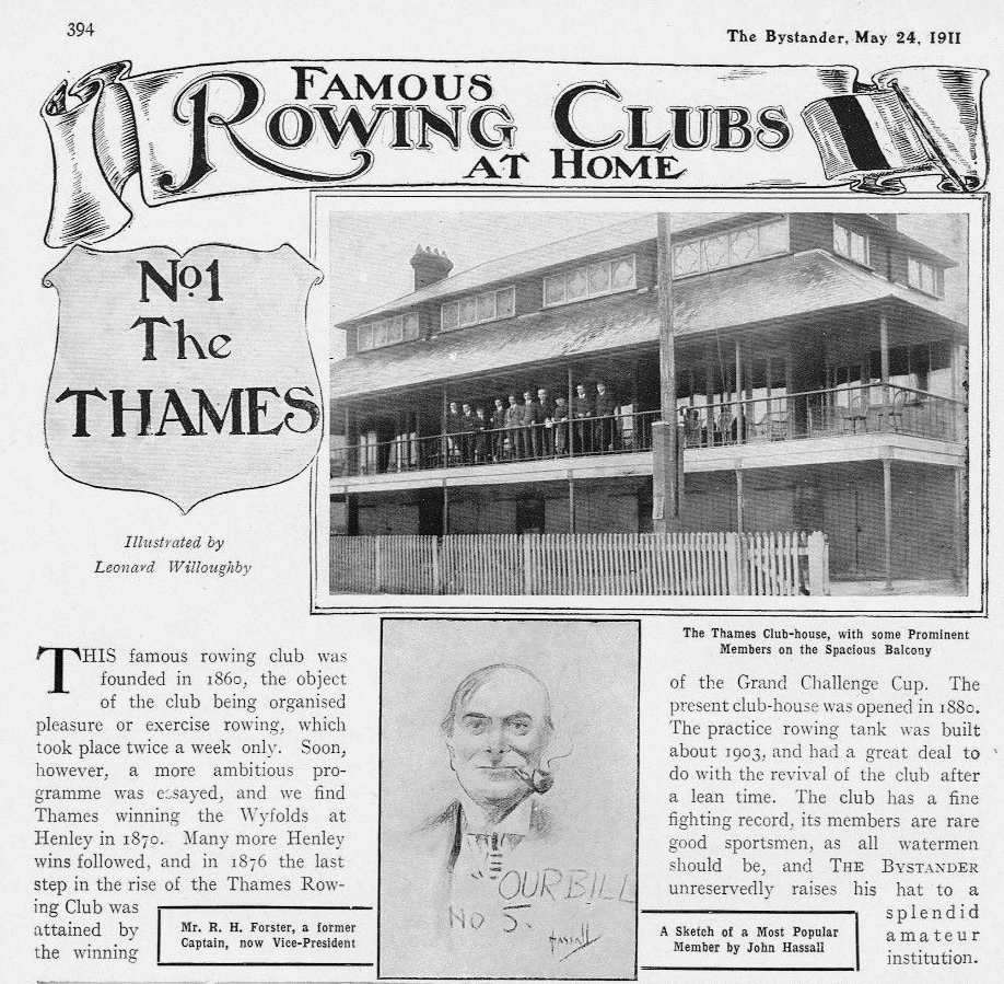 The picture above includes the entire text of Leonard Willoughby’s report on Thames Rowing Club, a shorter and much more deferential piece on the distinguished old Putney club than his often critical articles on small provincial rowing clubs that formed the rest of the Bystander magazine series. In Willoughby’s own words, ‘The Bystander unreservedly raises his hat to a splendid amateur institution’. At the time of writing, the relevant pages from an original copy of the magazine are for sale on eBay.