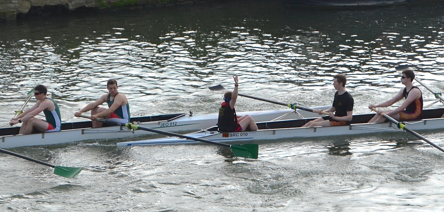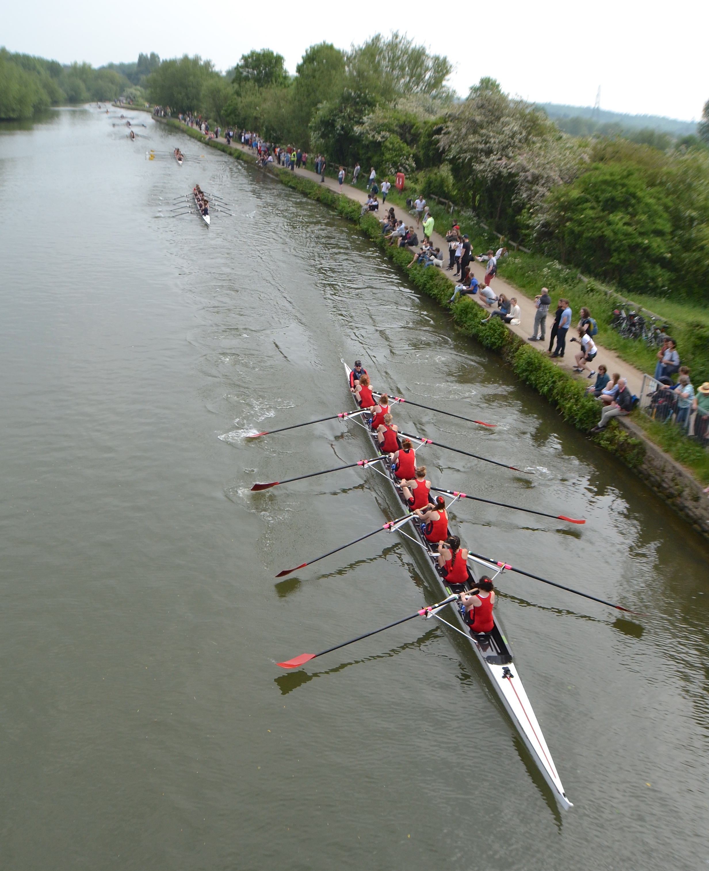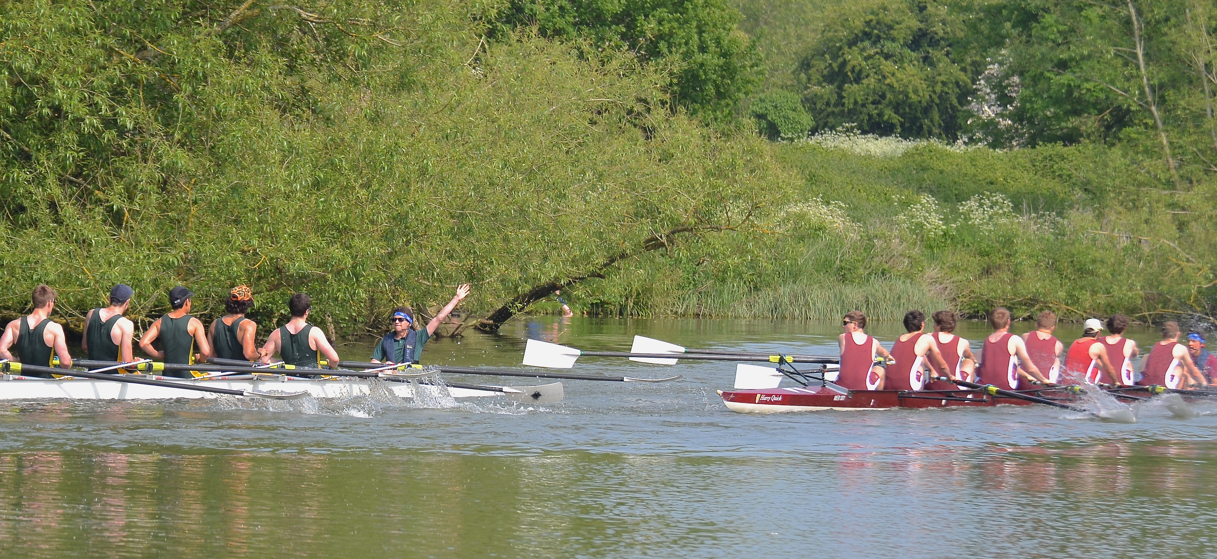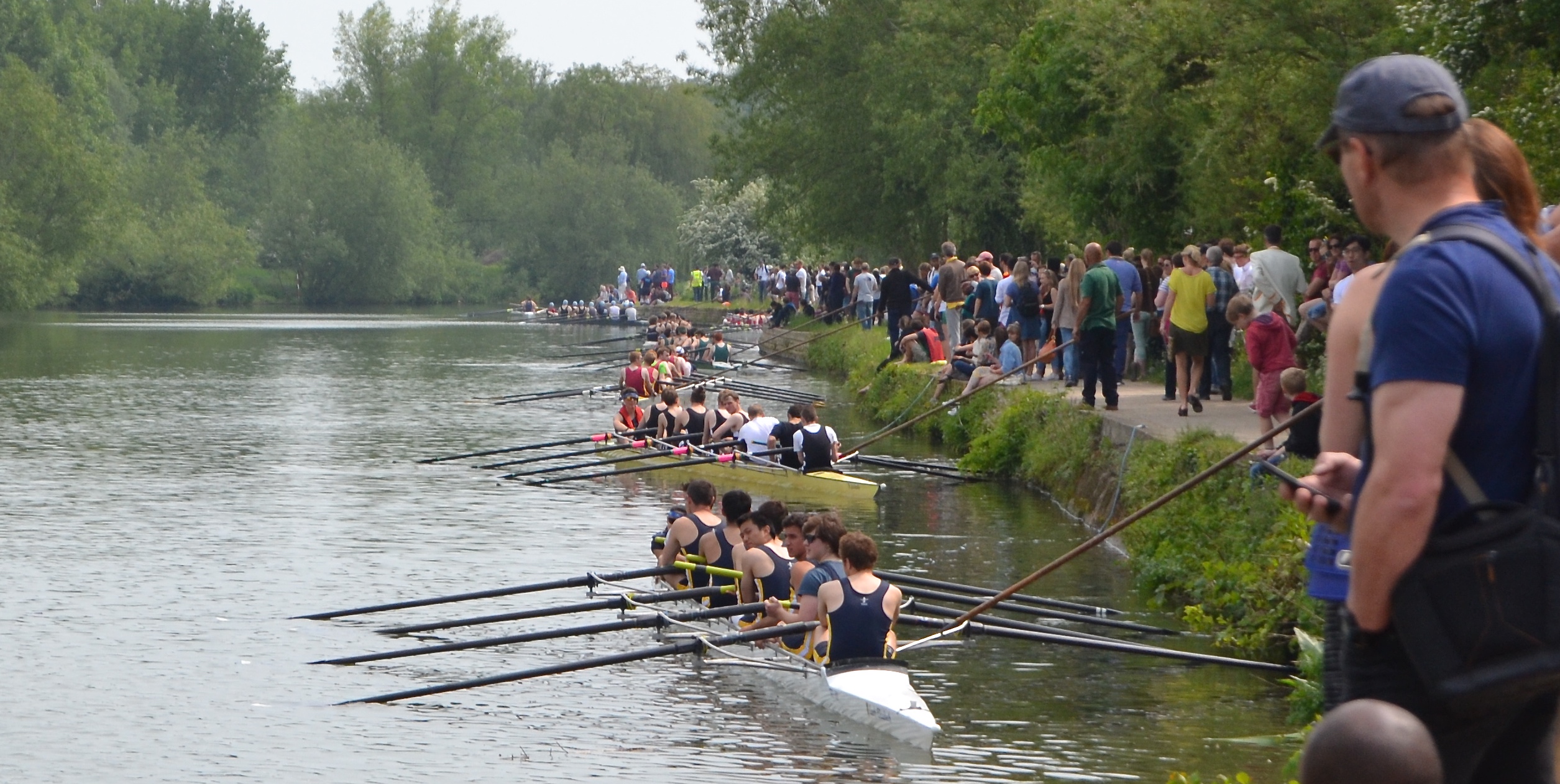 The view from Donnington Bridge, close to the start. In Women’s Division III, Green Templeton soon threaten St Peter’s.Green Templeton make a (non-physical) bump on St Peter’s. Both will now stop racing and pull into the side.The ‘Gut’ is a tricky bend in the course that has been the downfall of many crews. Here, in Men’s Division III, Exeter lead St Peter’s and Merton out of the Gut.Parallax error disguises it, but Merton bump St Peter’s, probably because the latter did not steer through the Gut as well as their opponents. The St Peter’s cox raises his hand to concede.Near the finish, opposite Boathouse Island, Jesus threaten Brasenose in Men’s Division II.Jesus bump Brasenose, who concede.