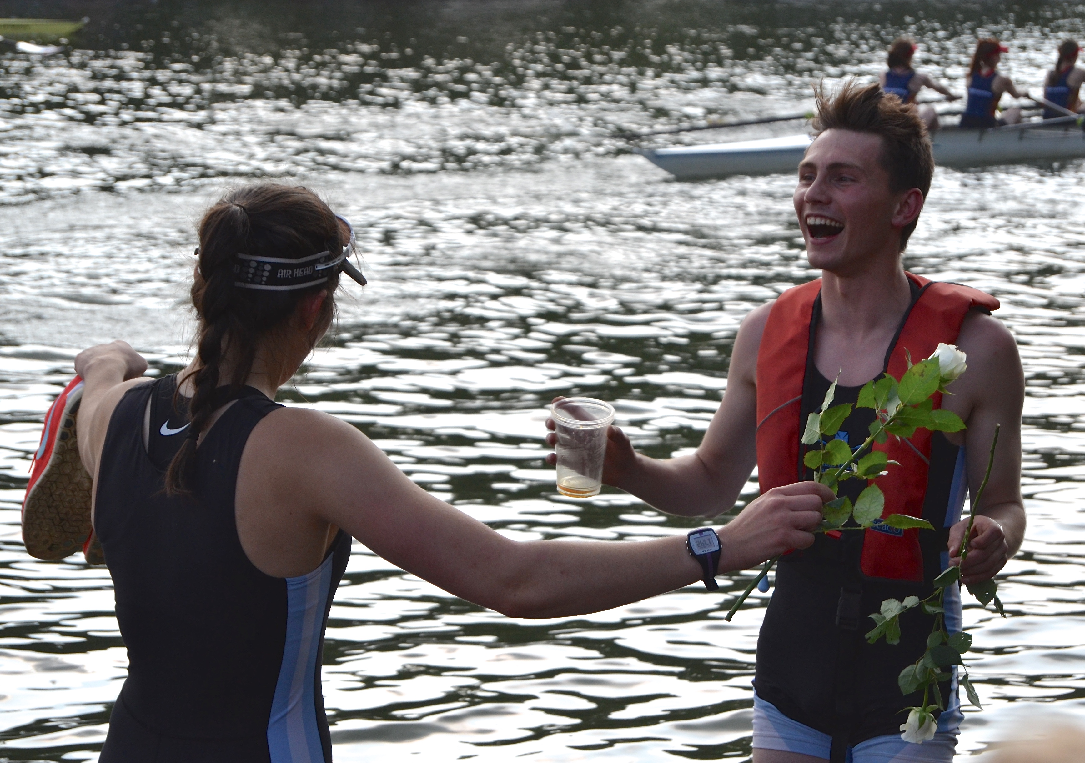 In Women’s Division V, Lady Margaret Hall (LMH) II celebrate something, possibly avoiding ‘spoons’ i.e. getting bumped every day. LMH’s Men’s Second Eight and Women’s First Eight both got ‘blades’ (illuminated oars) for bumping every day and both bumped up a rare five places into the division above.Regent’s Park, rowing in Women’s Division IV, celebrate winning blades. They bumped New College II, Lincoln II, Oriel II and Christ Church II.Corpus Christi (I think), who were top of Women’s Division III for two days and then suffered a bump a day after that. When rowers get wet, they tend to stick together.