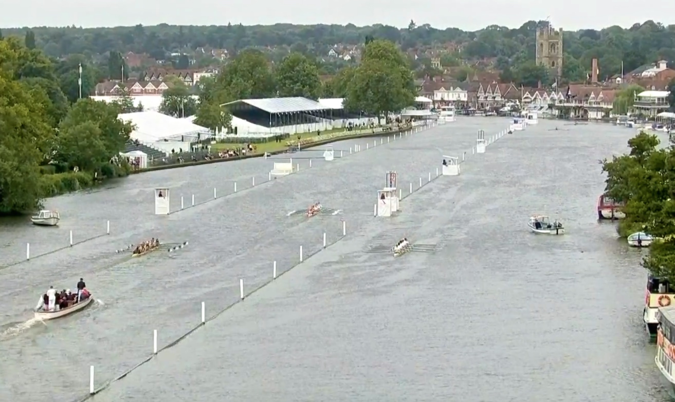 Conditions deteriorated as the day went on, causing very difficult steering conditions. One victim was the Lady Elizabeth Boat Club from Ireland, who hit the booms after 600m, leaving Tideway Scullers to take a comfortable win in the club coxless fours event, the Wyfolds.