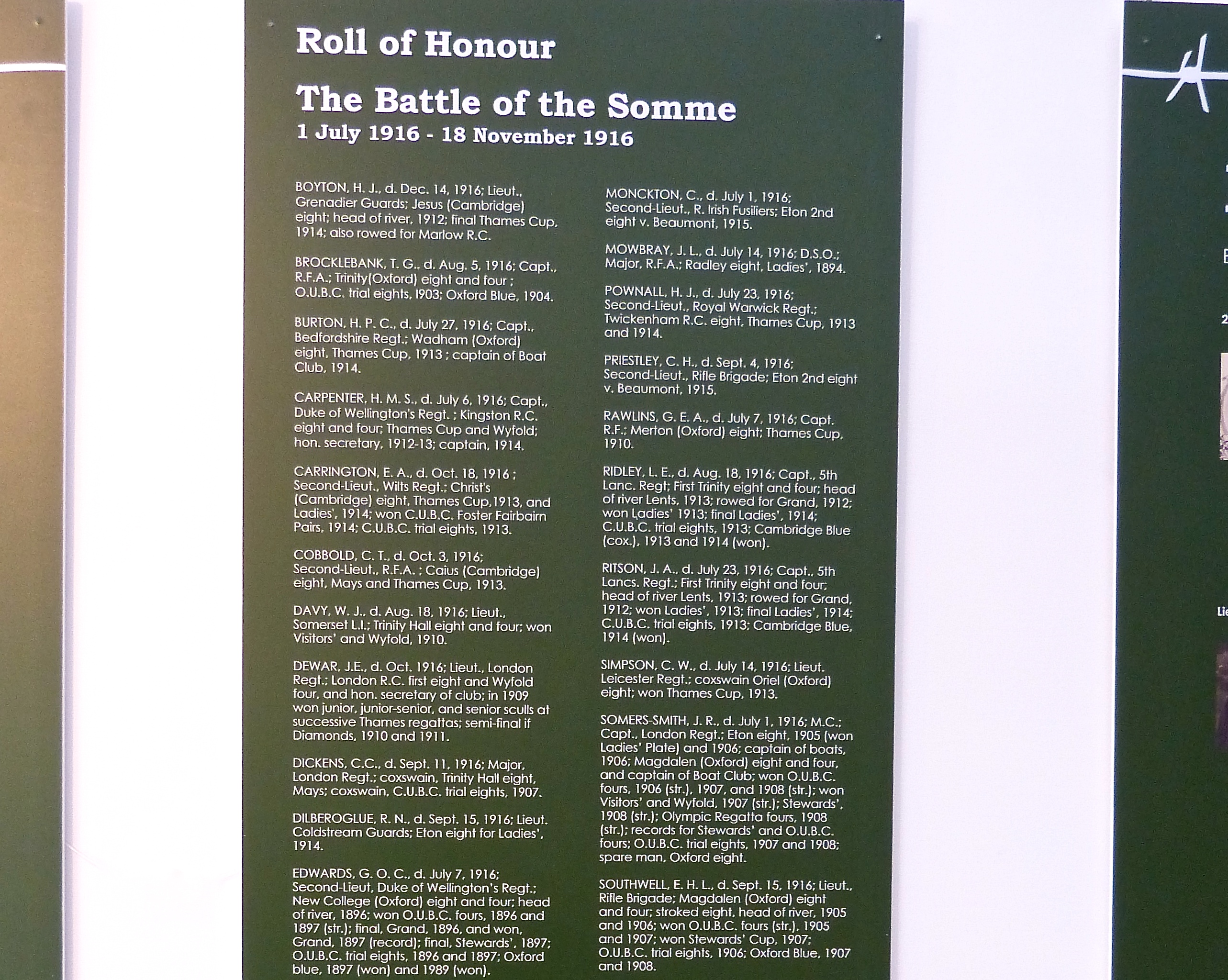 In the Henley trophy tent, the Regatta together with the River and Rowing Museum has a display titled “Rowing Heroes at War: The Battle of the Somme”.