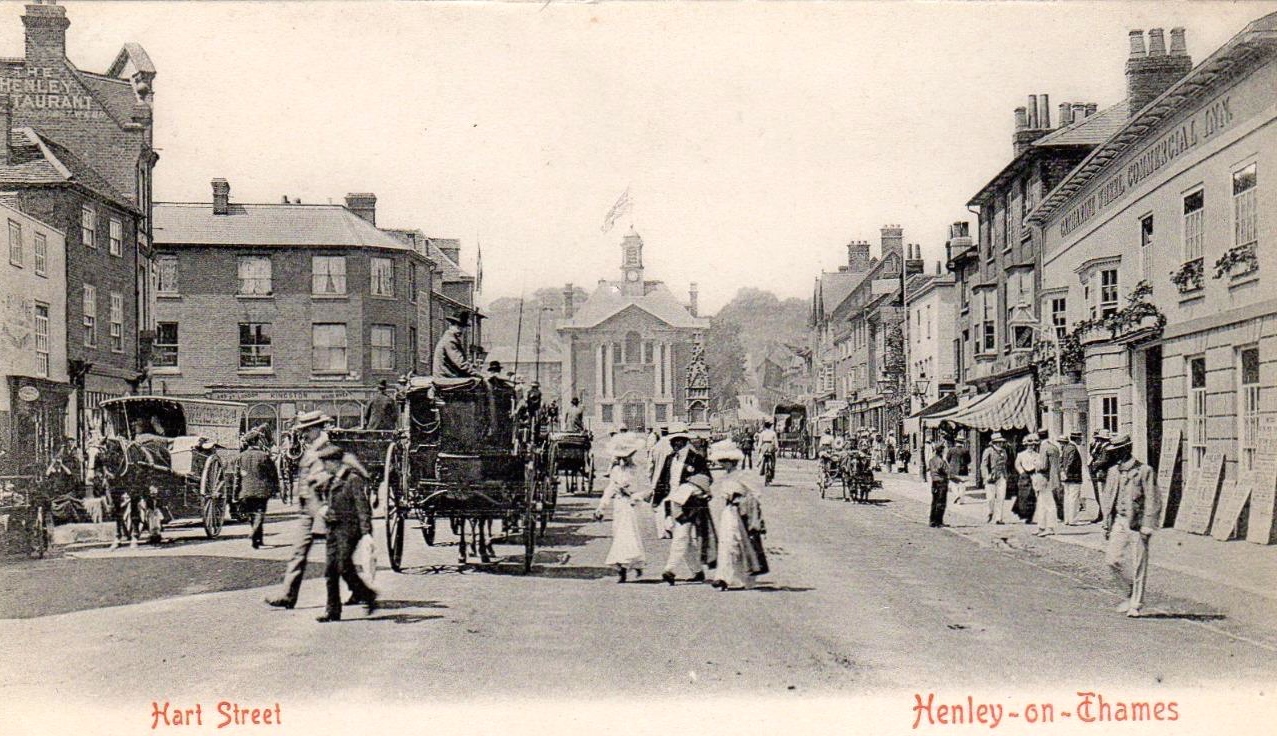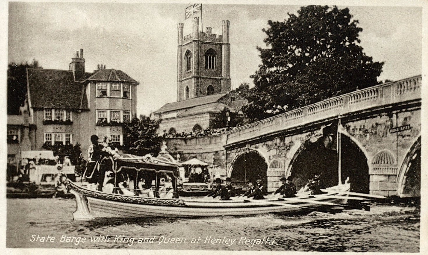 The Belgian winners of the Grand in 1909.A grandstand erected outside the Red Lion Hotel.A favourite view on a card posted in 1904.More of the same.A race in the Diamond Sculls. When I originally posted this article, I suggested that the indistinct names on the board on the left were Fitte and Blackstaffe. We rowing history nerds like a challenge and, as can be seen in the comments section below, it seems fairly certain that the names are actually Fox and Blackstaffe and that the year is 1901.Before the 1914 -1918 War, houseboats lined the Bucks bank. The look very romantic but there were constant complaints that their lavatories discharged directly into the river.Temple Island out of Regatta time.Henley’s main street and town square is little changed.The Red Lion Lawn still exists.King George V and Queen Mary visited Henley Regatta in 1912. Here the Royal Barge, rowed by the Royal Watermen, goes through Henley Bridge.