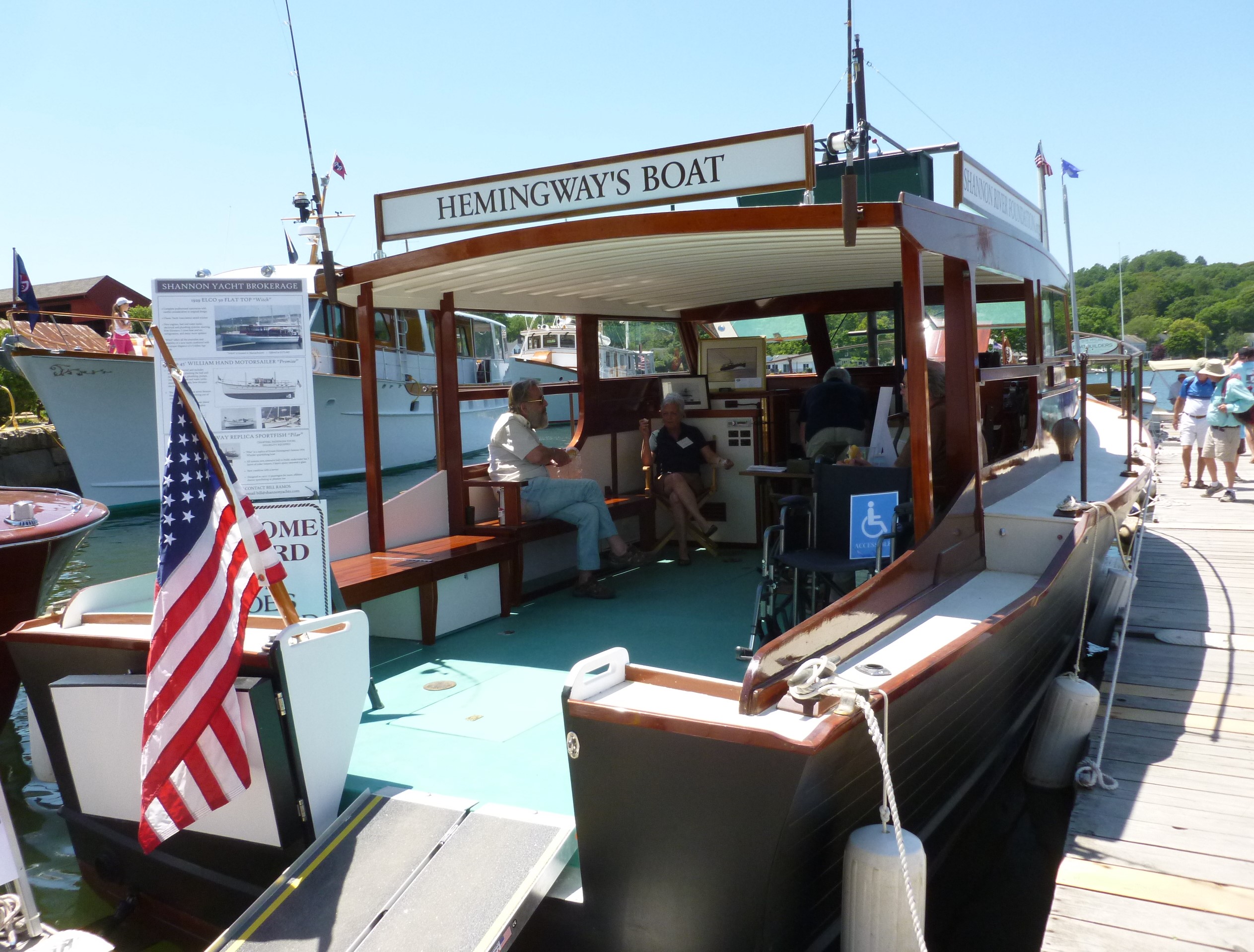Strolling around on the second day of this year’s WoodenBoat Show at Mystic Seaport in Mystic, Connecticut, I came across a boat that I had missed on the previous day’s visit: a replica of Ernest Hemingway’s 1934 Wheeler fishing boat, the 38-foot Pilar.