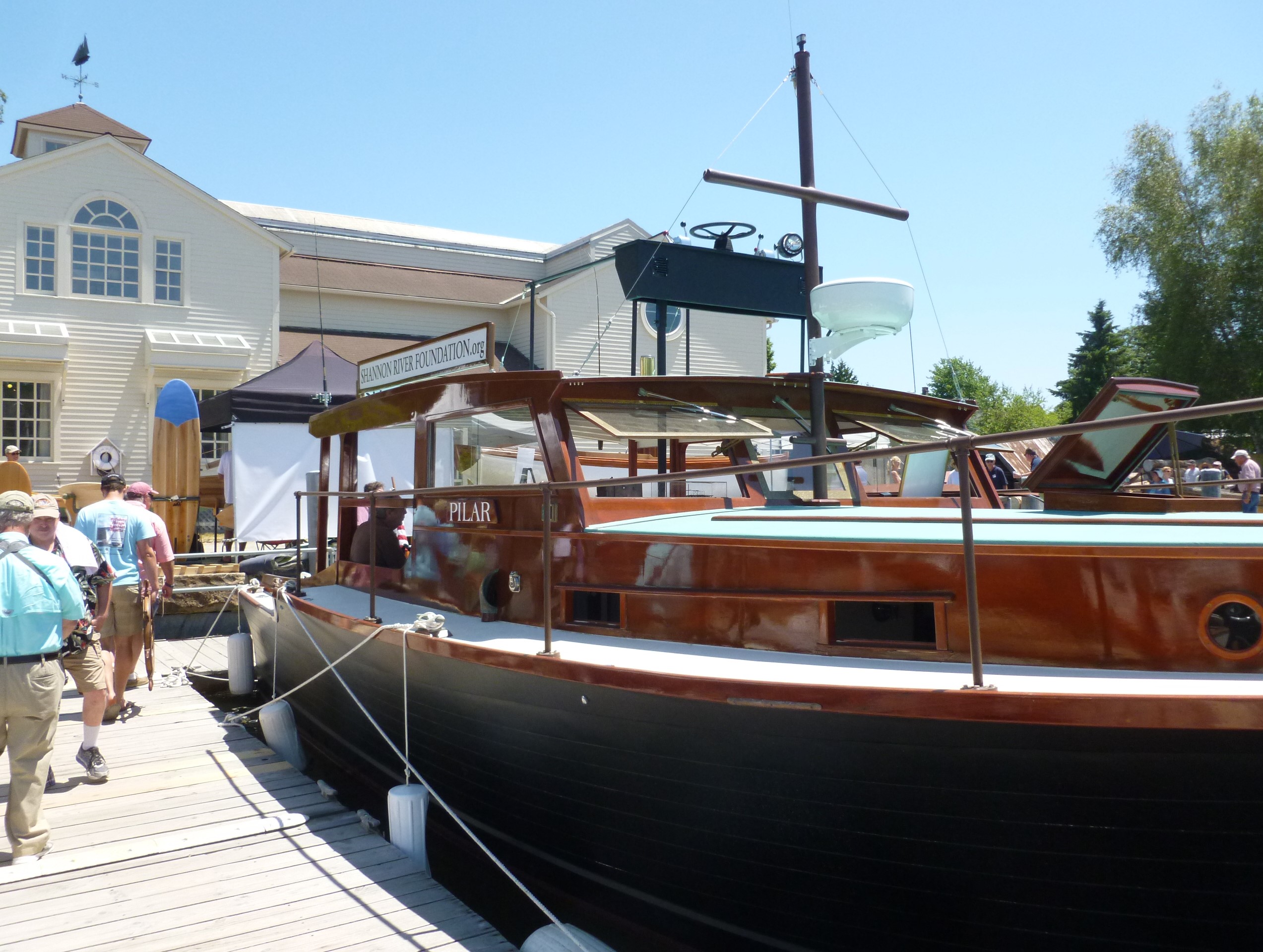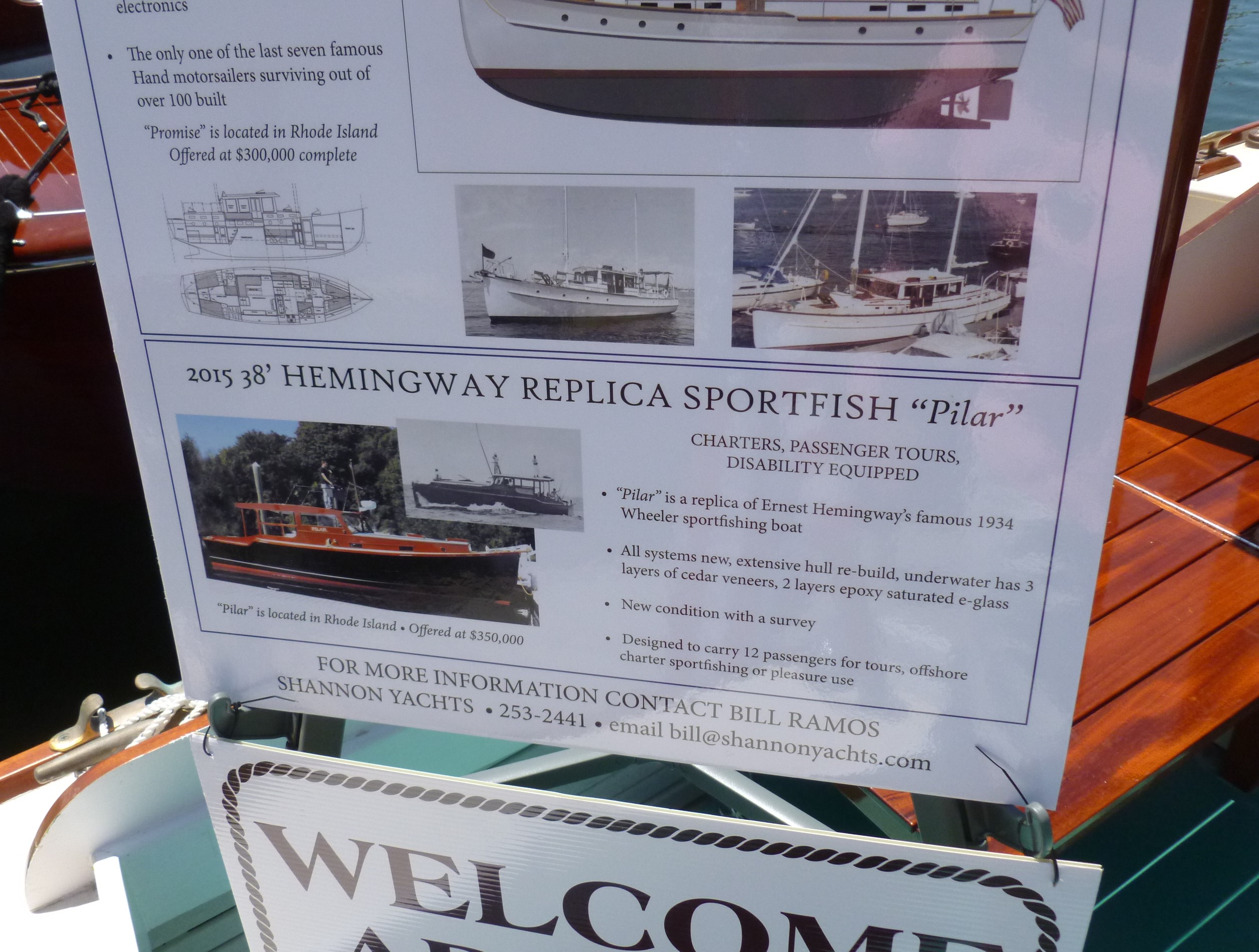 The boat was docked in the south boat area at the show, but as there were vendors’ tents on the museum grounds, hiding whichever boats were docked in this area, it was first when you stepped down on the docks that you could really see her and the other exhibited vessels which were tied up there. A sign invited WoodenBoat Show visitors aboard ‘Hemingway’s boat’ Pilar. This replica of the author’s famous fishing boat belongs to the Shannon River Marine Heritage Foundation (SRMHF) in New Bedford, Massachusetts. The original Pilar is located at Hemingway’s house Finca Vigia, outside of Havana, Cuba, which is now a museum.