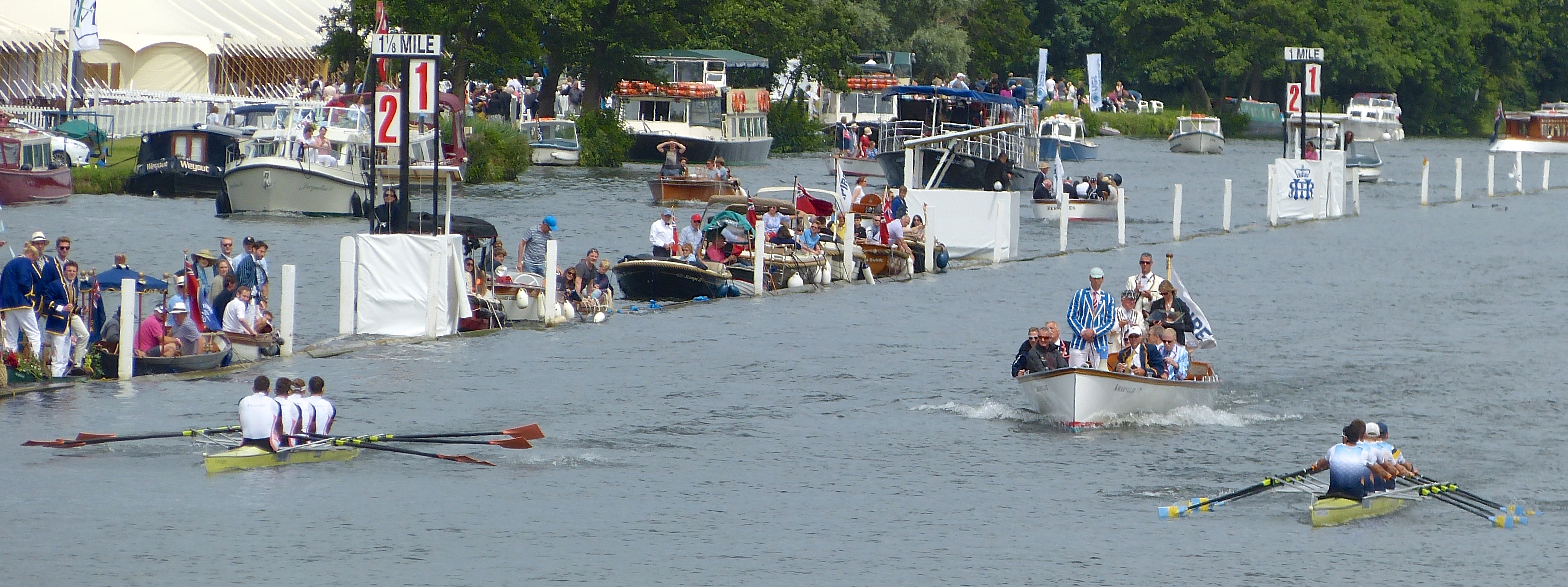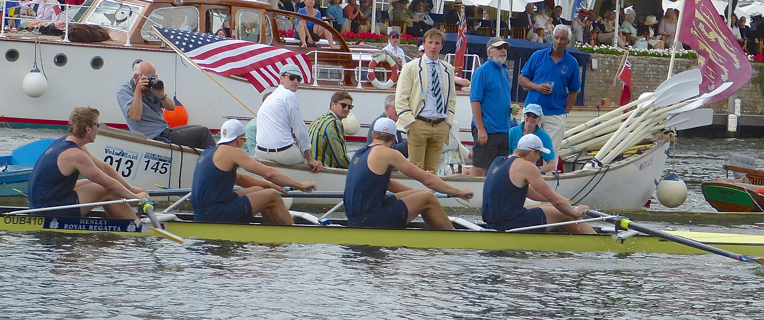 Drama (though arguably less tragic) also occurred in the men’s intermediate coxless fours. There was an Englishman, an Irishman, a New Zealander and a South African – and they won the Visitors’ in the last few strokes. No joke. The defending champions, Cal Berkley, had a strong start and built up a good lead. However, the Thames crew, three of whom were in the TRC boat that won the Thames Cup last year, did not give up and pushed at the Stewards’ Enclosure and, in responding, the Californians’ rowing became increasingly ragged, causing them to hit the booms and stop rowing about three strokes before the line. A view from the floating grandstand is on YouTube.