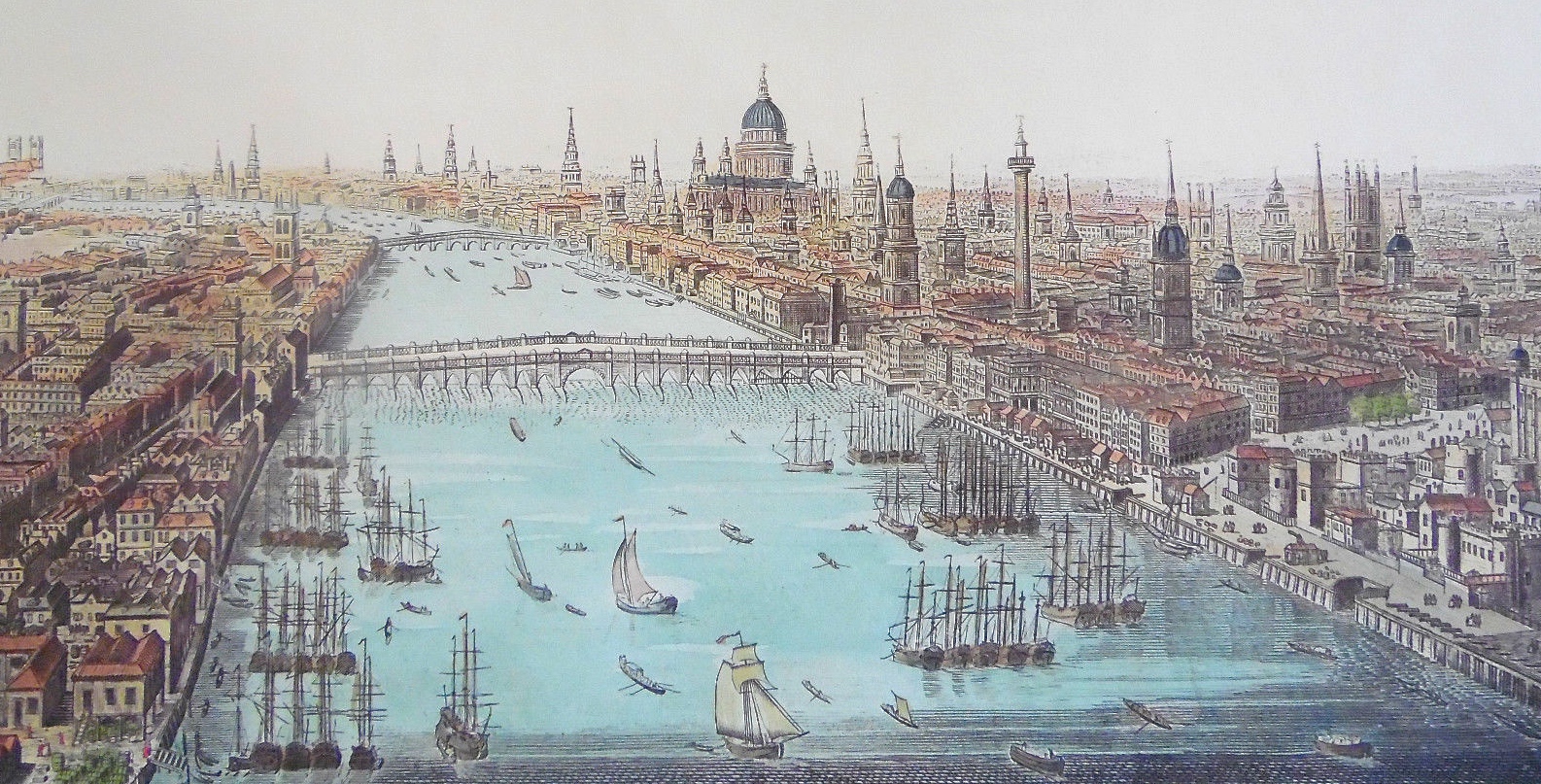 Looking west along the Thames in 1794. In the foreground is ‘Old London Bridge’, 1209-1831, the start point for the Doggett’s Coat and Badge. This shows the first 3,000 metres of the race, as far as Westminster. The other bridge is the first one built at Blackfriars, opened in 1769.