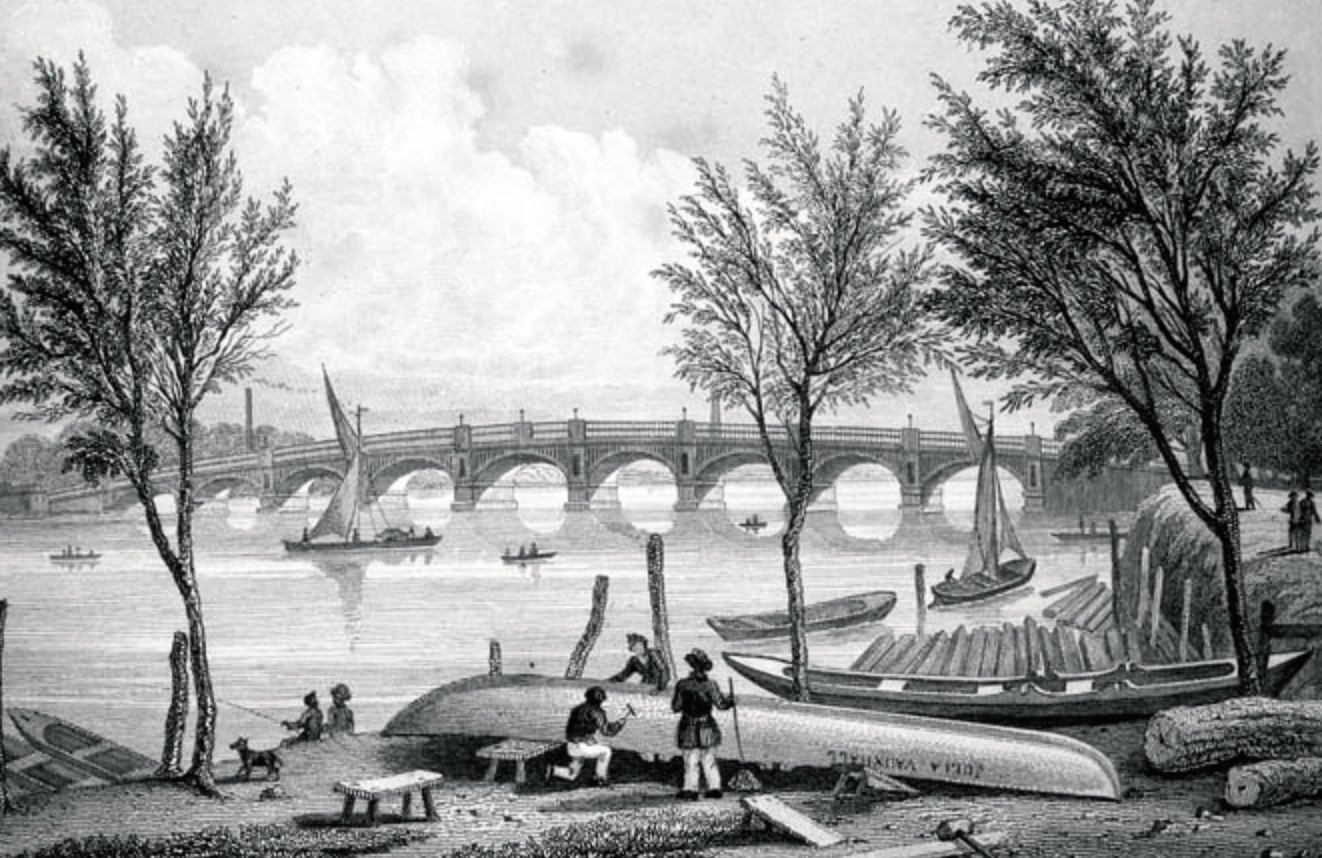 A picture taken during this year’s Doggett’s. The eventual winner, Ben Folkard, is about to go under Grosvenor Bridge (originally known as Victoria Railway Bridge). On the right, on the north bank, are the grounds of the old soldiers’ home, the Royal Hospital Chelsea. In the 18th century this was the site of Ranelagh Gardens.